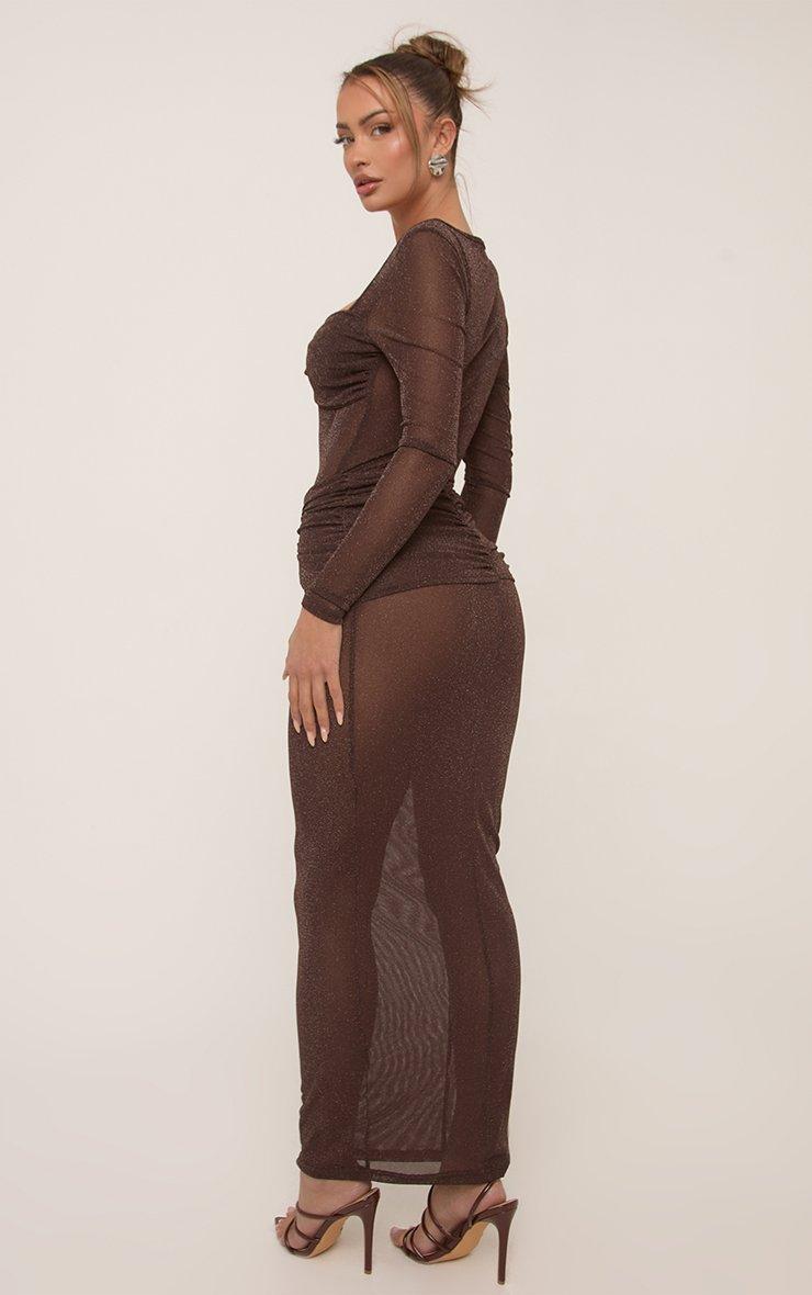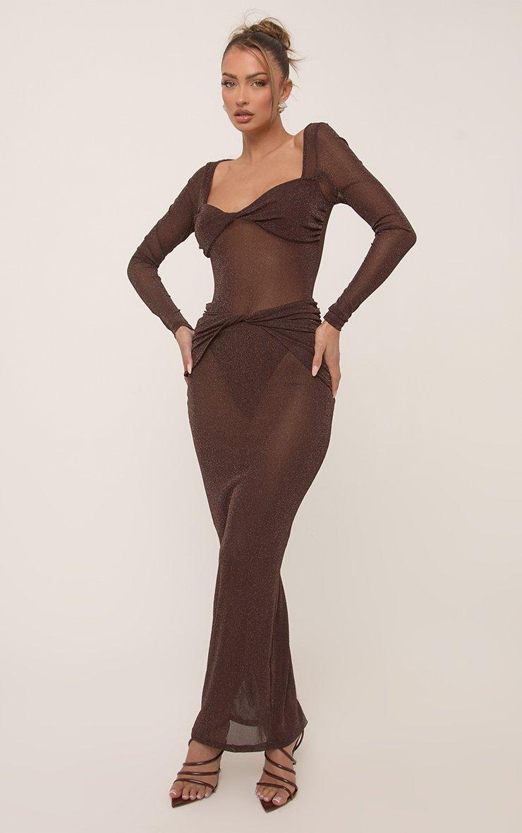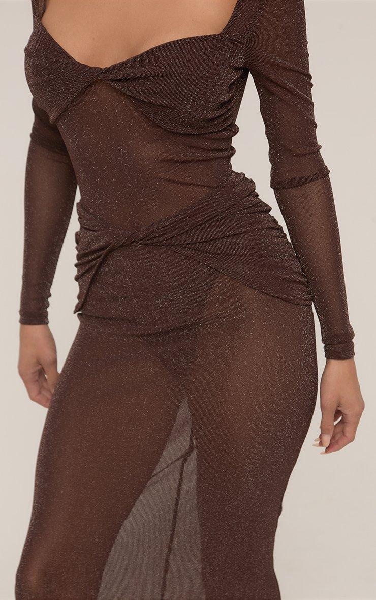 High Twisted Waist Maxi Skirt In Brown Glitter Mesh