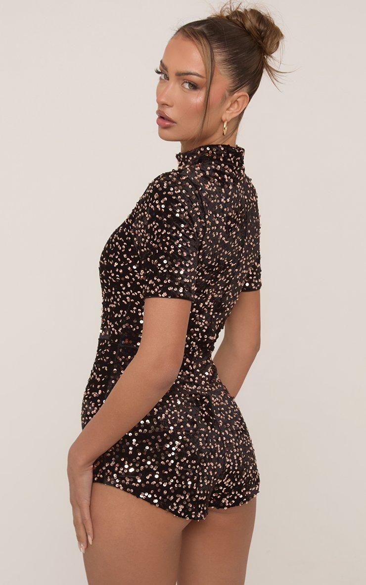 Short Sleeve High Neck Micro Playsuit In Black Velvet Sequin