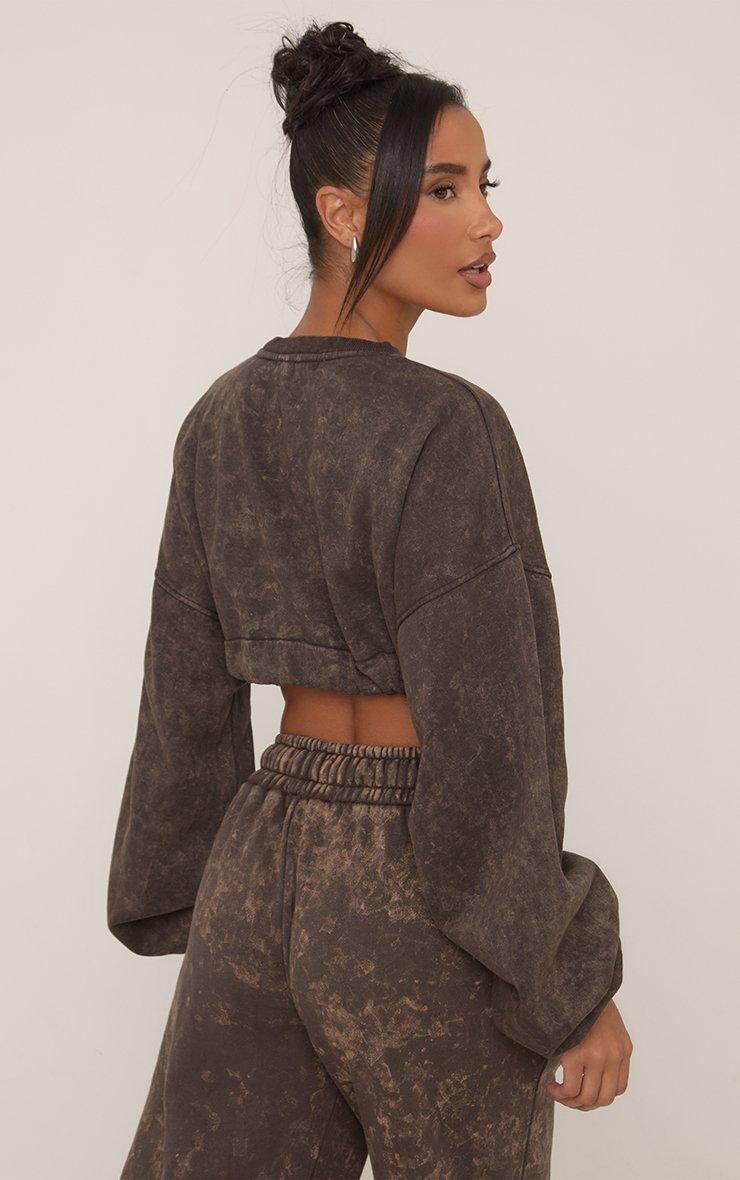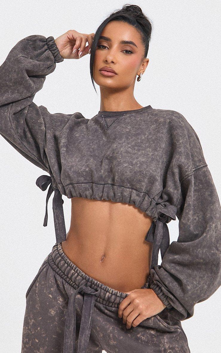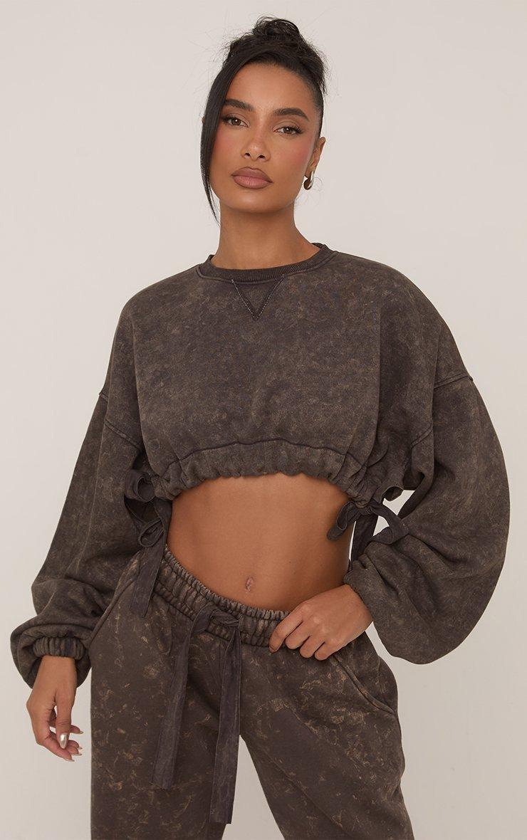 Keep it chic and cozy, doll! Featuring a chocolate acid wash fabric with long sleeves, ruched detailing, and a tied hem, this cropped sweatshirt adds a touch of edge to your laid-back style.