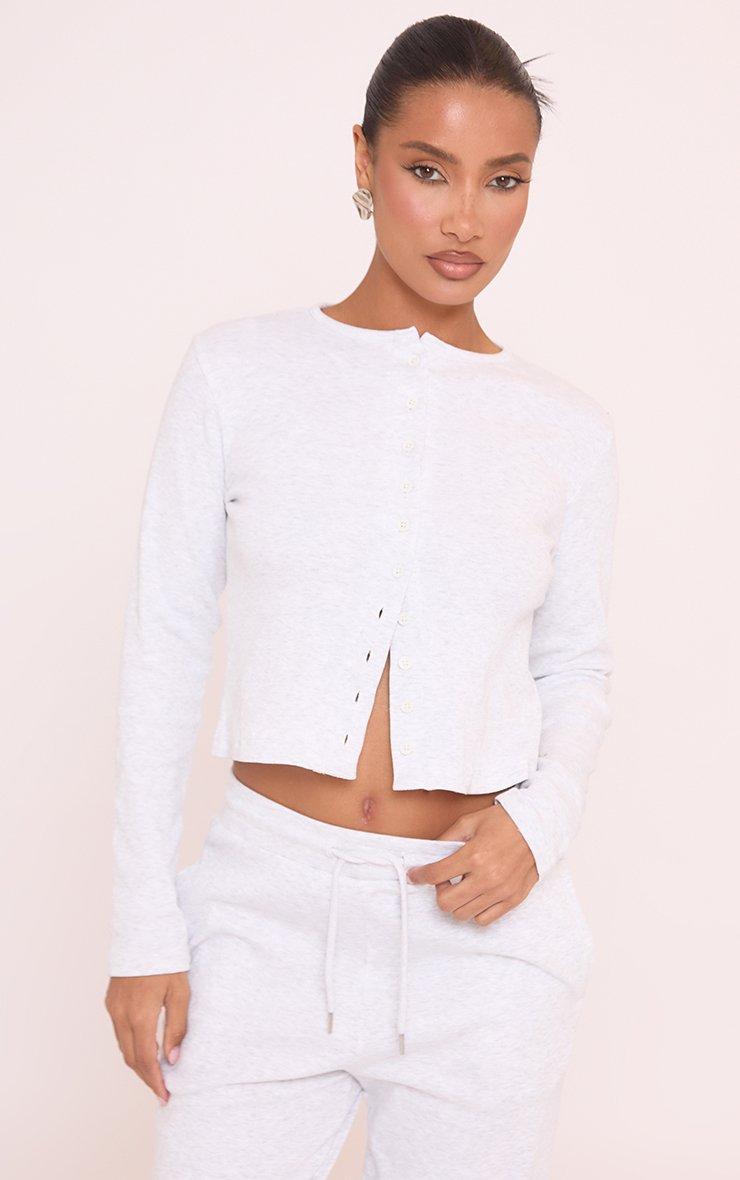 Long Sleeve Button Front Top And Wide Leg Trousers Co-Ord Set In Grey Ribbed