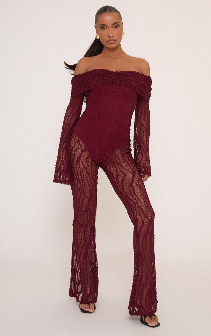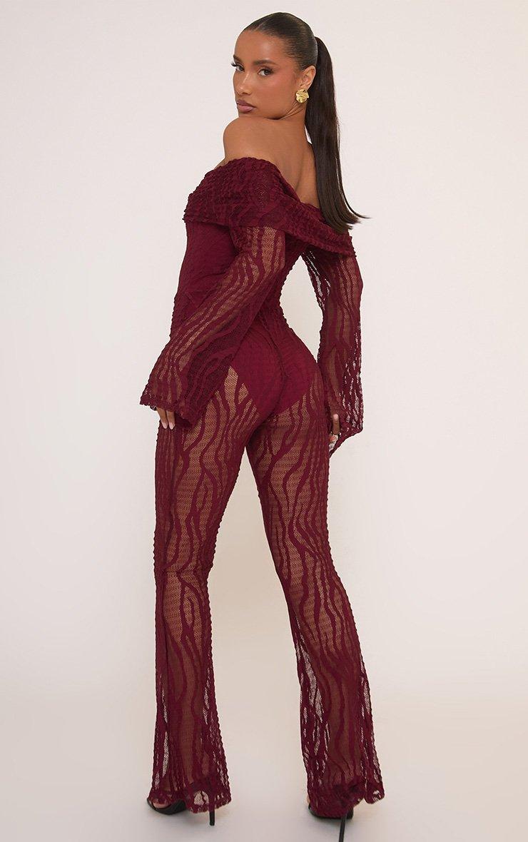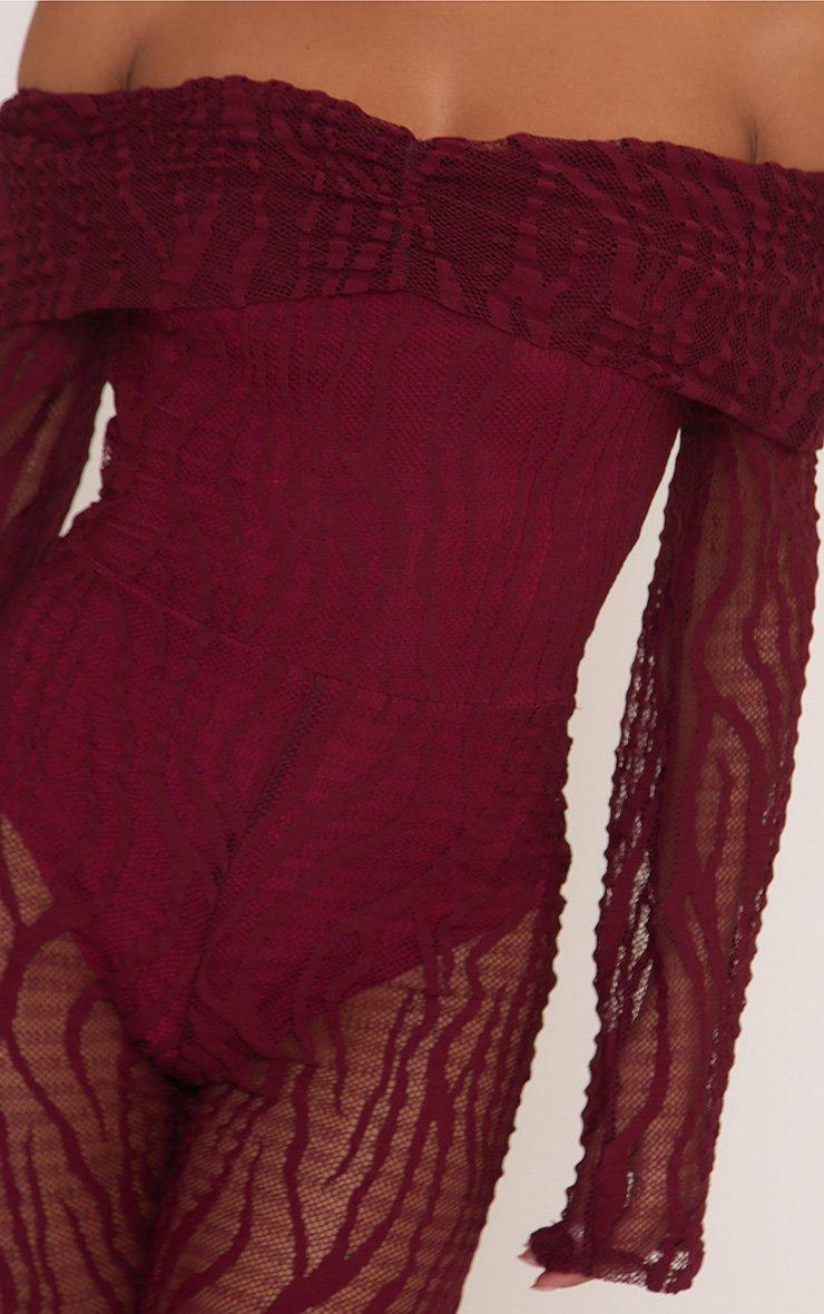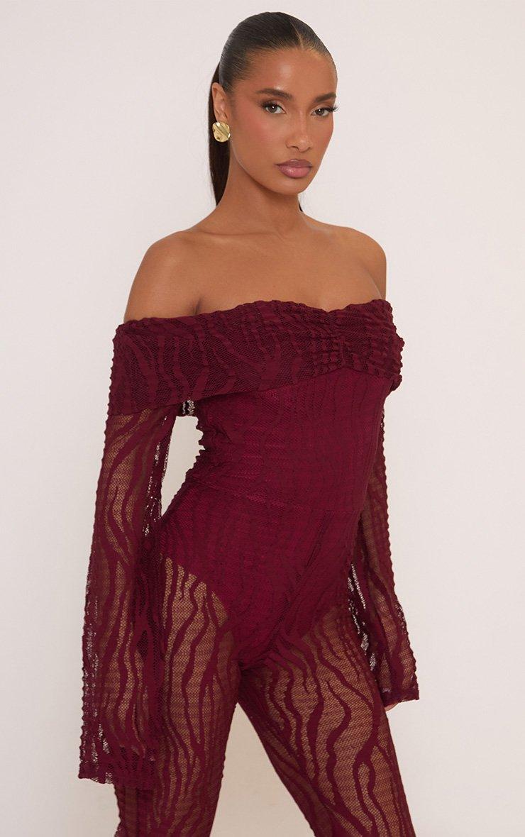 Fold Over Bardot Jumpsuit In Burgundy Zebra Textured Lace
