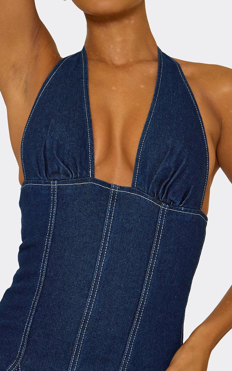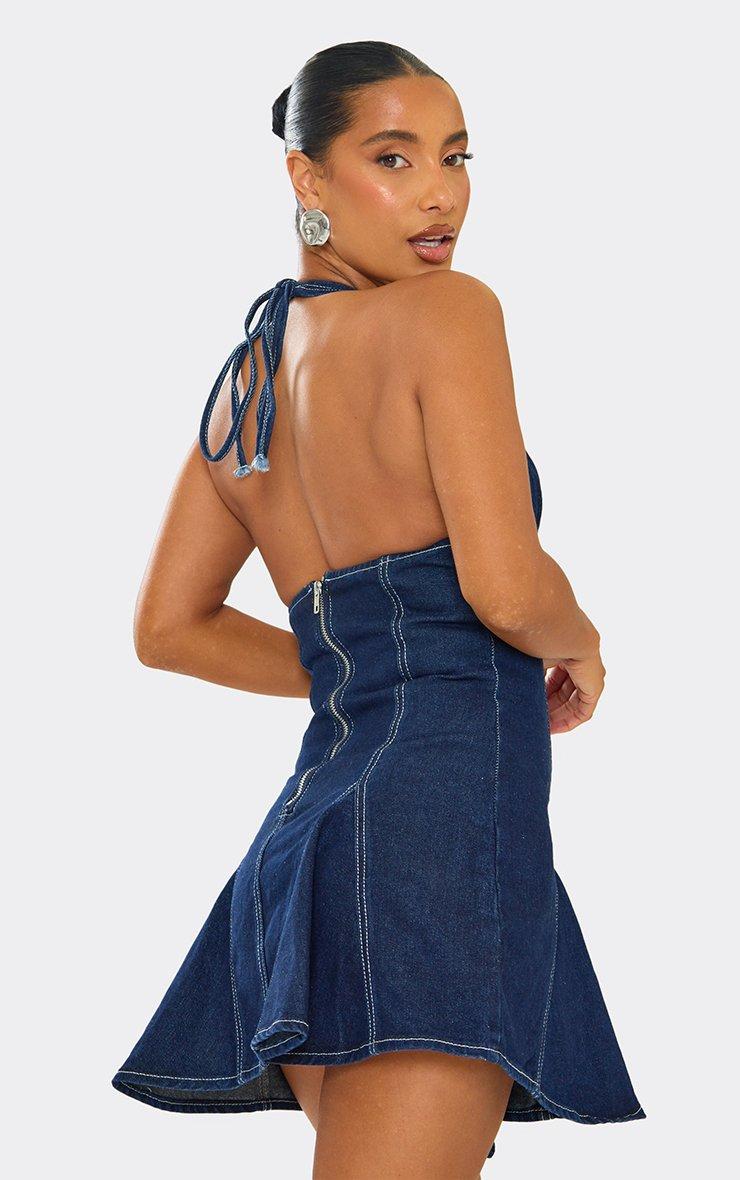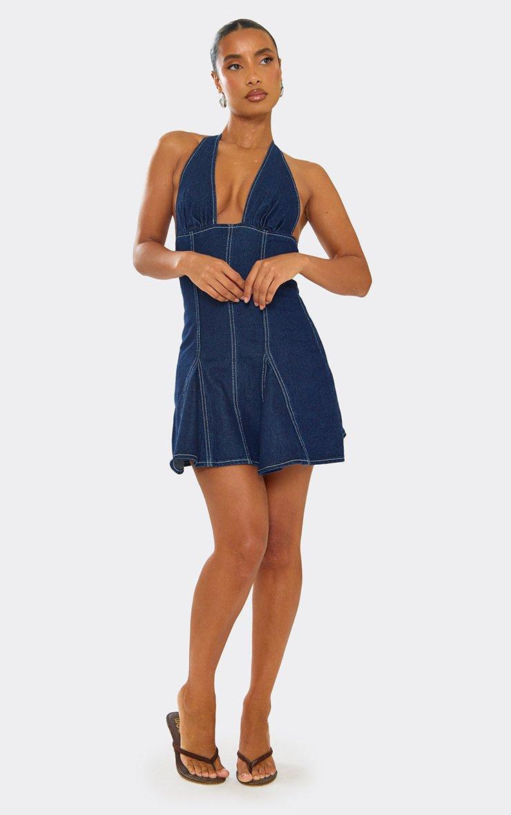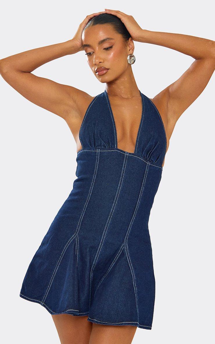 Plunge Neck Skater Dress In Indigo Blue Denim