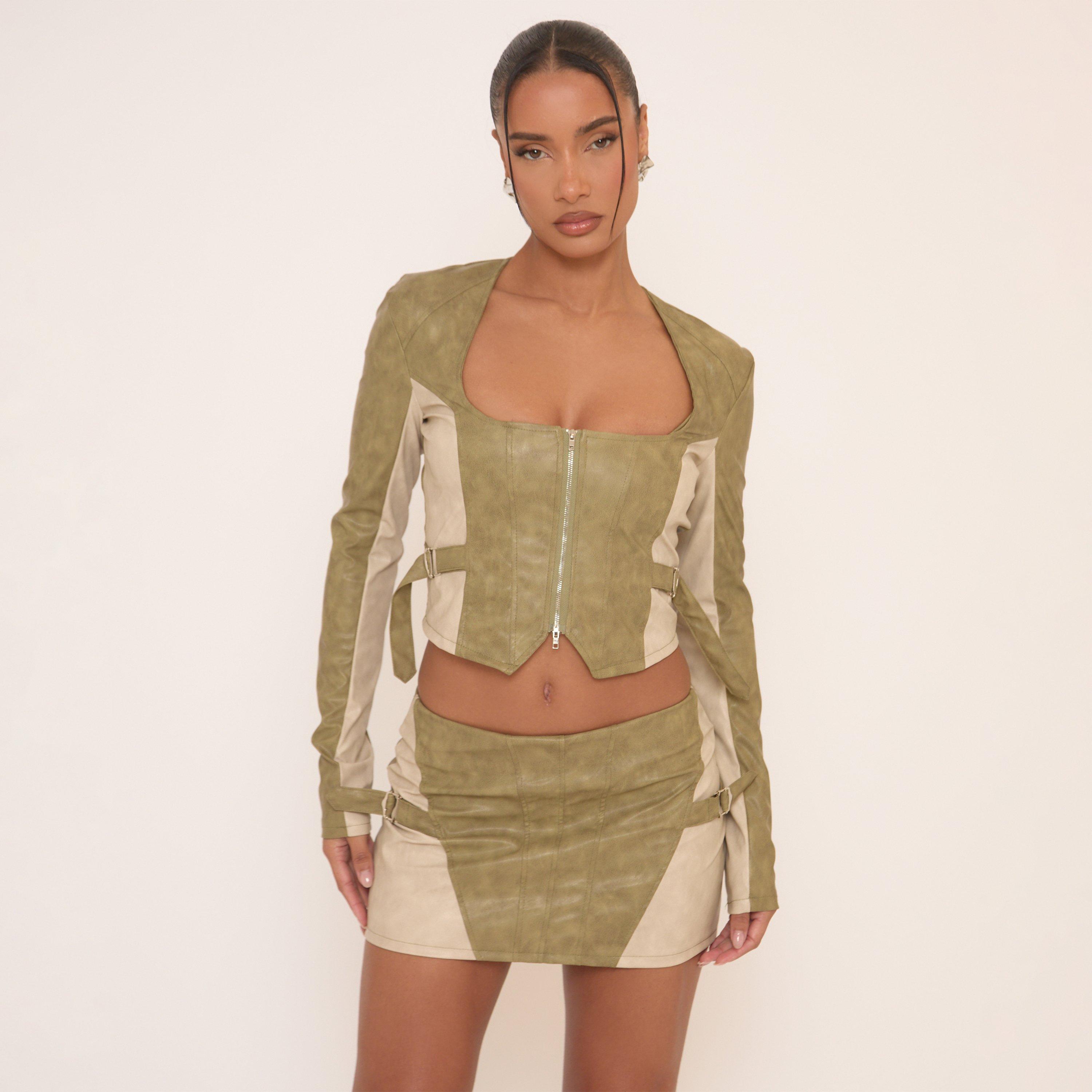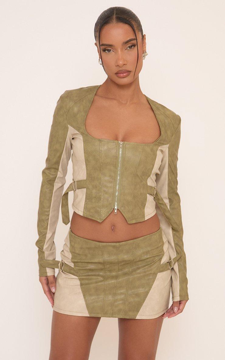 Long Sleeve Zip Up Front Buckle Detail Top In Khaki Faux Leather