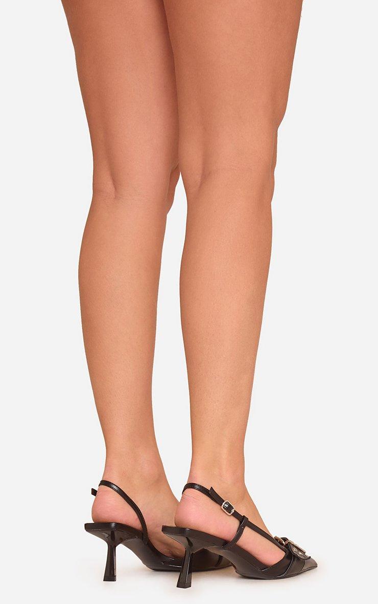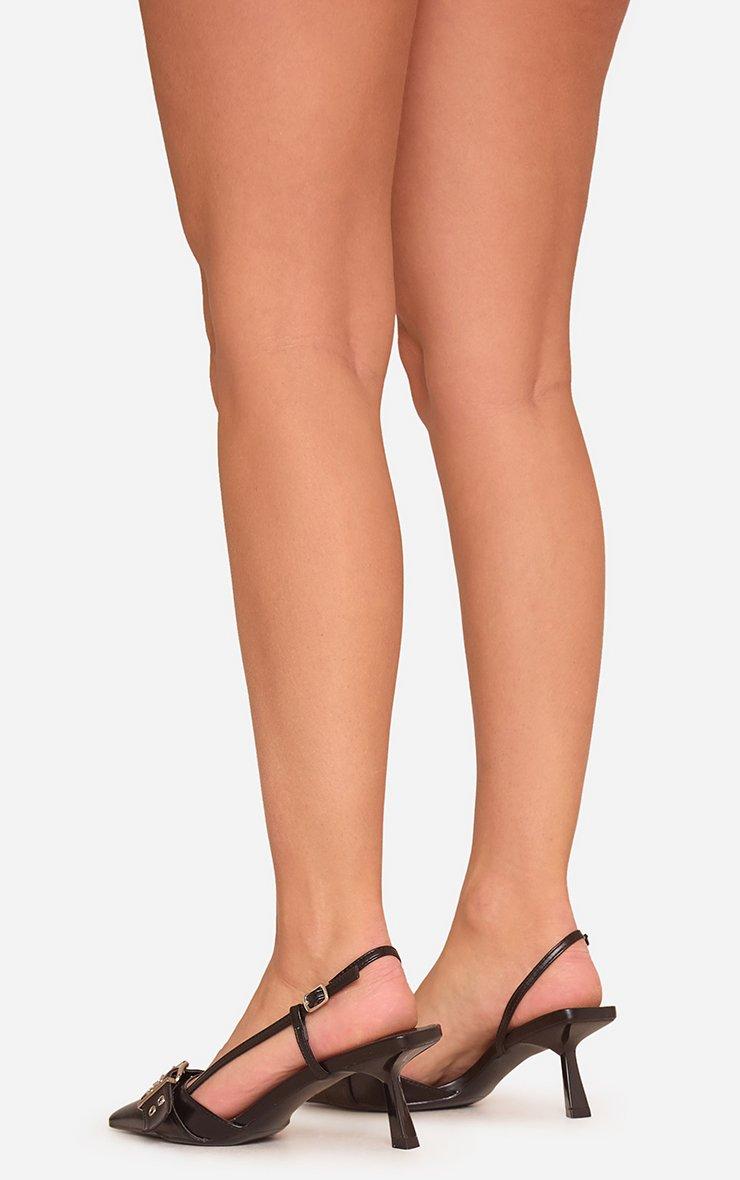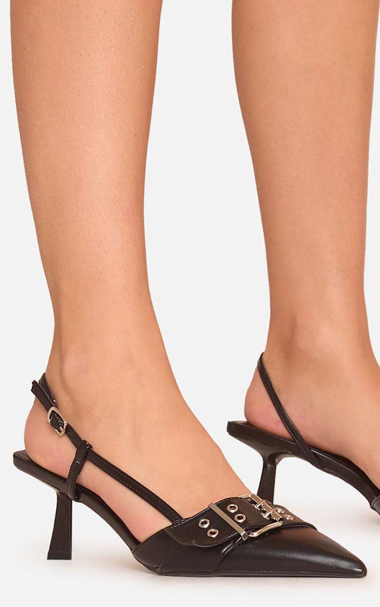 Trish Buckle Detail Pointed Toe Slingback Court Heel In Black Faux Leather