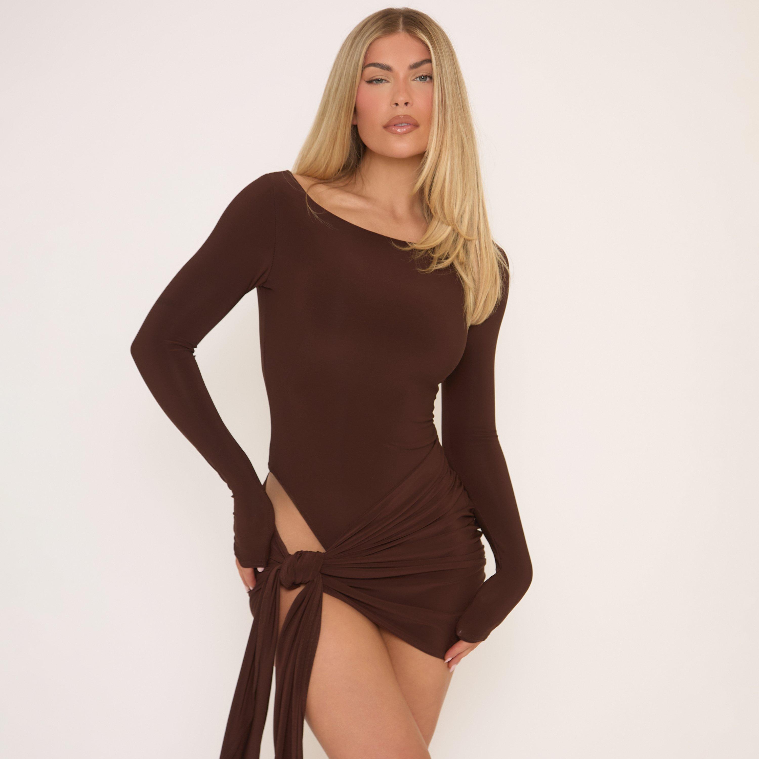Long Sleeve Slash Neck Wrap Detail Mini Bodycon Dress In Brown