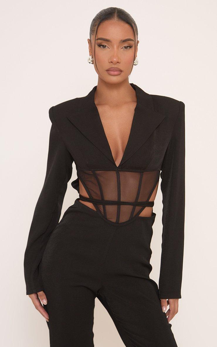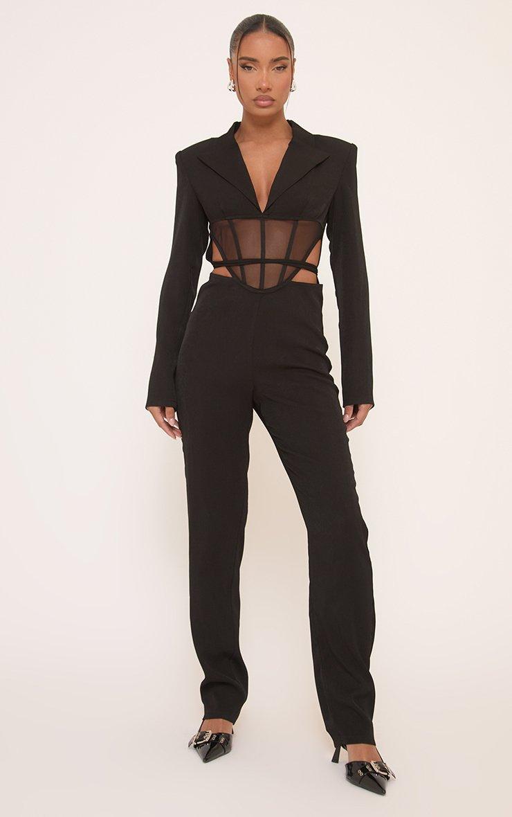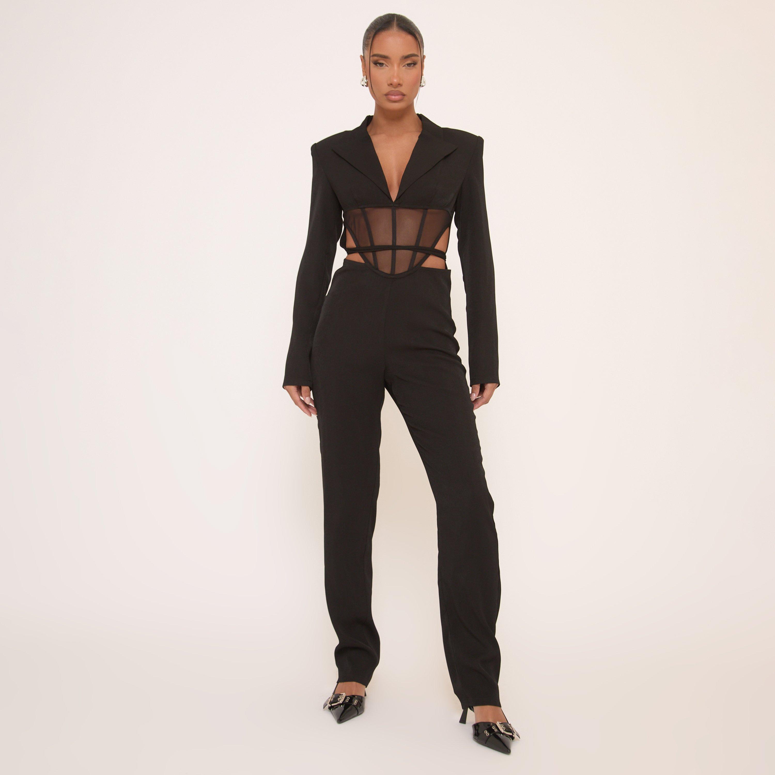 Long Sleeve Mesh Insert Cut Out Corseted Tailored Jumpsuit In Black.