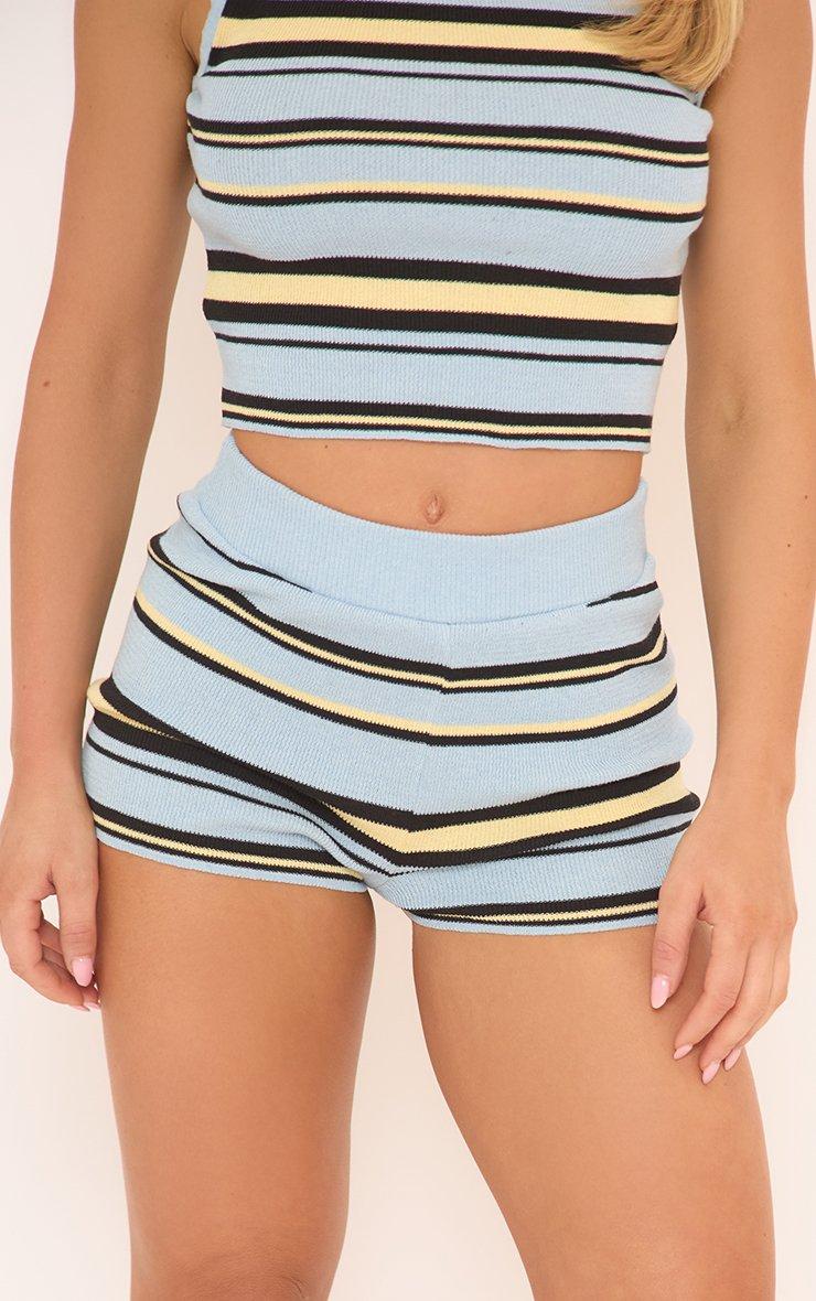Add a playful pop to your summer wardrobe with these mid rise stripe shorts in a blue multi knit. Designed in a soft textured fabric with a comfy elasticated waist, they bring that effortless cool-girl vibe with their vibrant stripe pattern and laid-back fit.