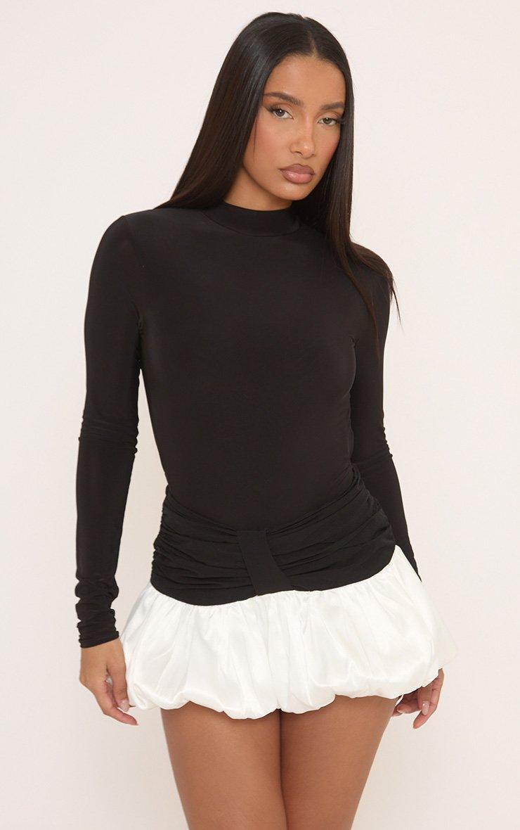 Turn heads, doll. Featuring a black fabric with a dropped waist, contrast hem, and puffball silhouette, this mini skirt adds playful volume and bold flair to any outfit.