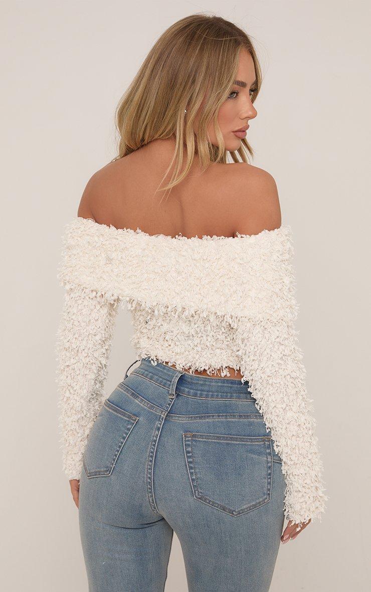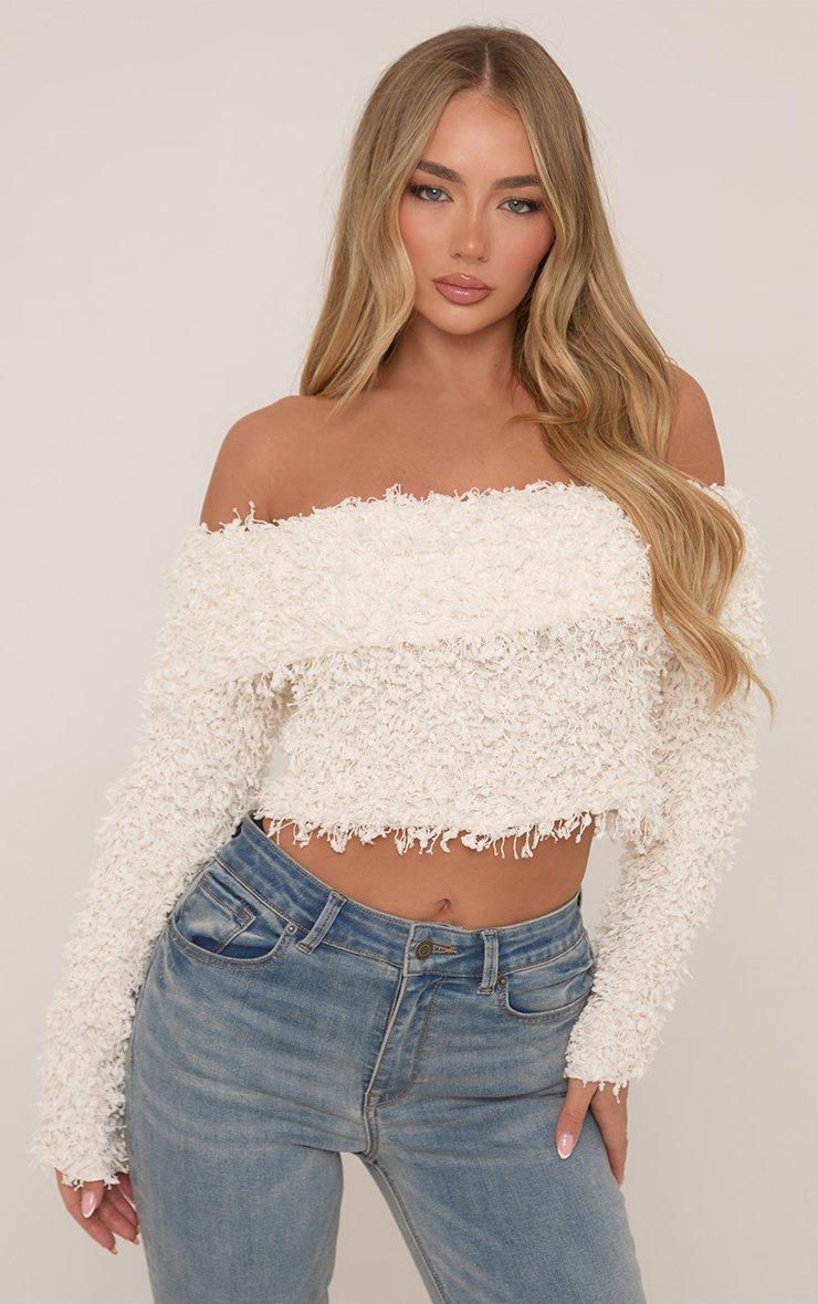 Long Sleeve Bardot Crop Top In Cream Shaggy