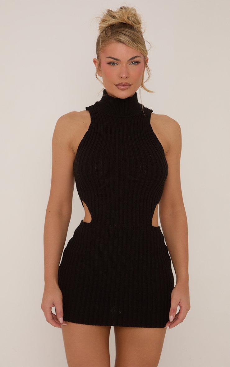 High Neck Cut Out Waist Mini Dress In Black Ribbed Knit