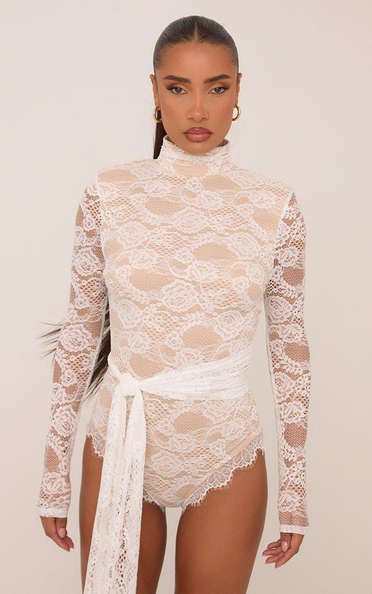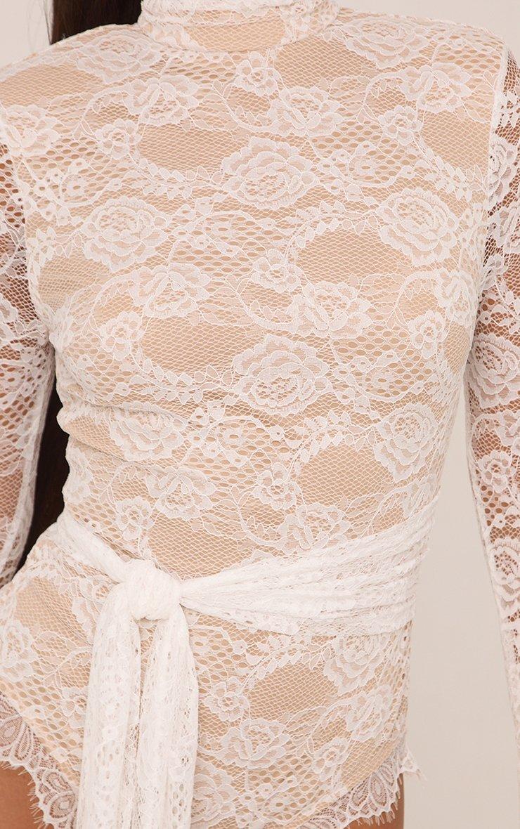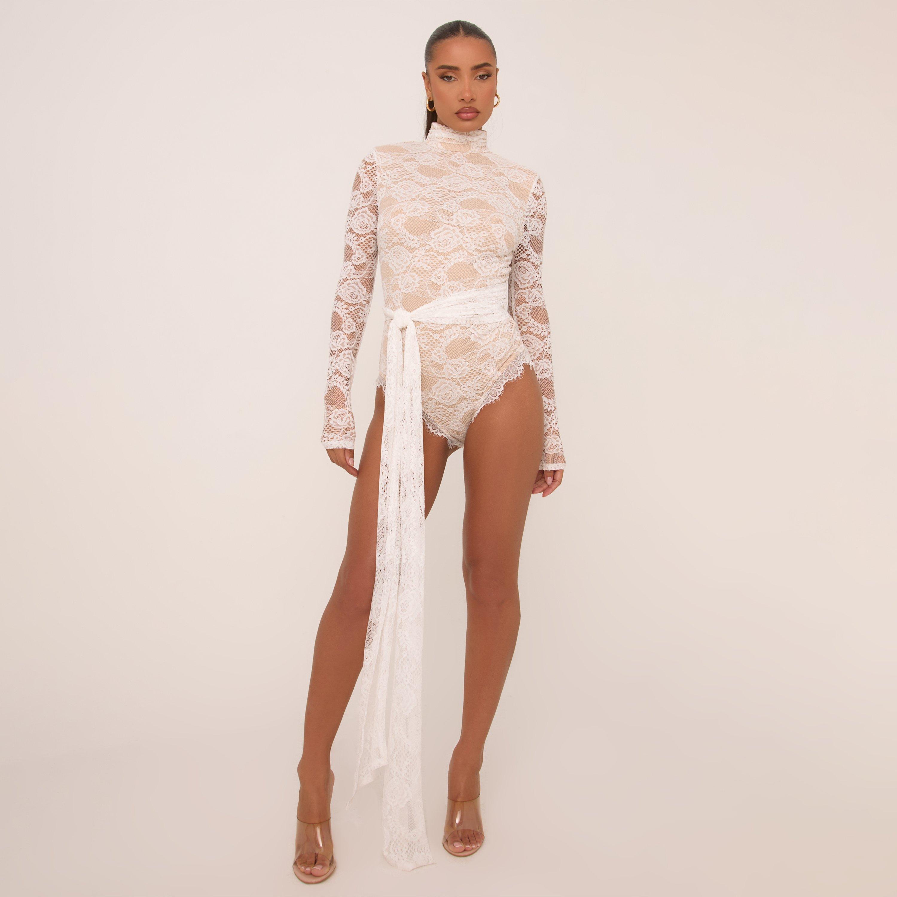 Long Sleeve High Neck Draped Micro Playsuit In White Lace