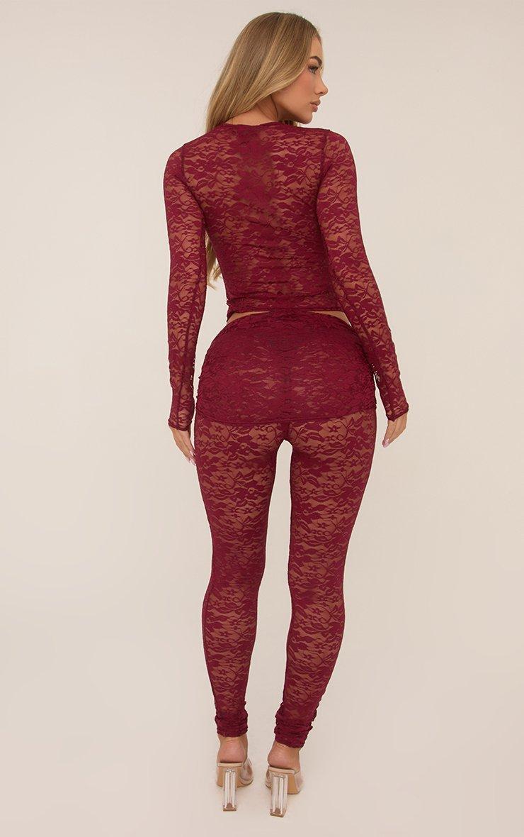 Fold Over Waistband Leggings In Burgundy Lace