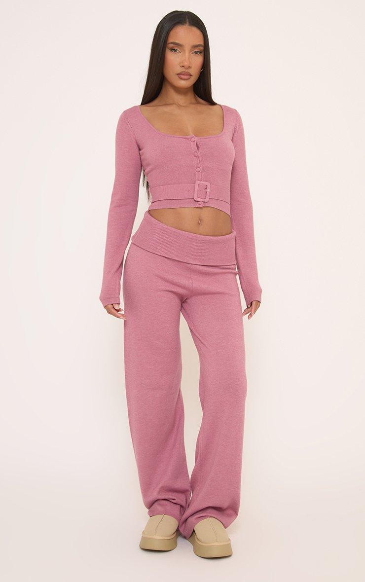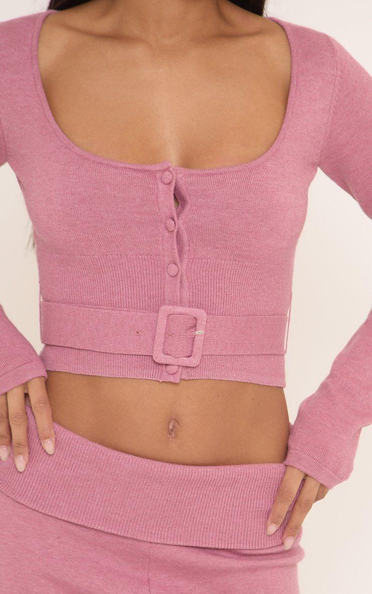 Long Sleeve Button Front Belted Fitted Top In Pink Knit