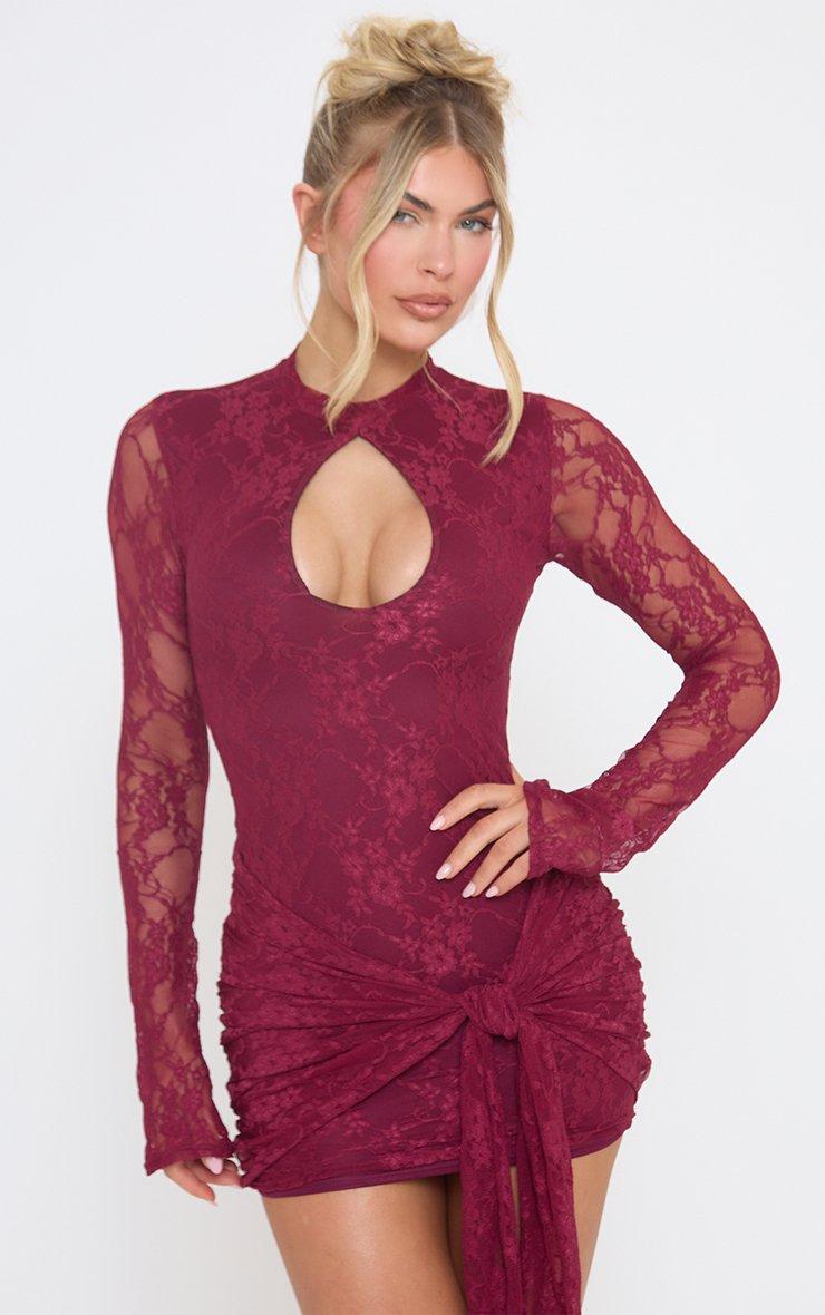 Long Sleeve Keyhole Cut Out Wrap Detail Mini Dress In Burgundy Lace