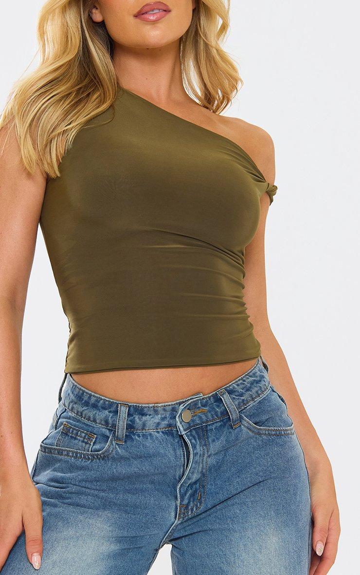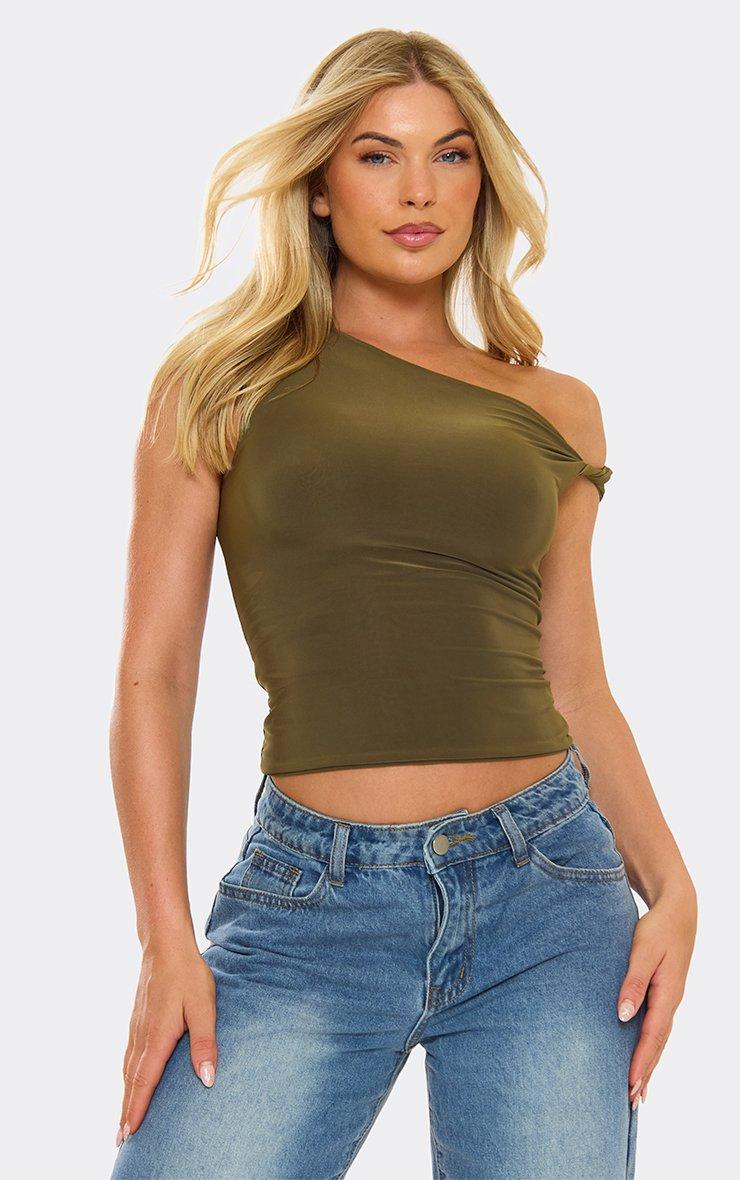 Bring the edge, doll! Featuring khaki slinky fabric, this twist strap top pops with sleek detailing for a bold, chic finish full of attitude.