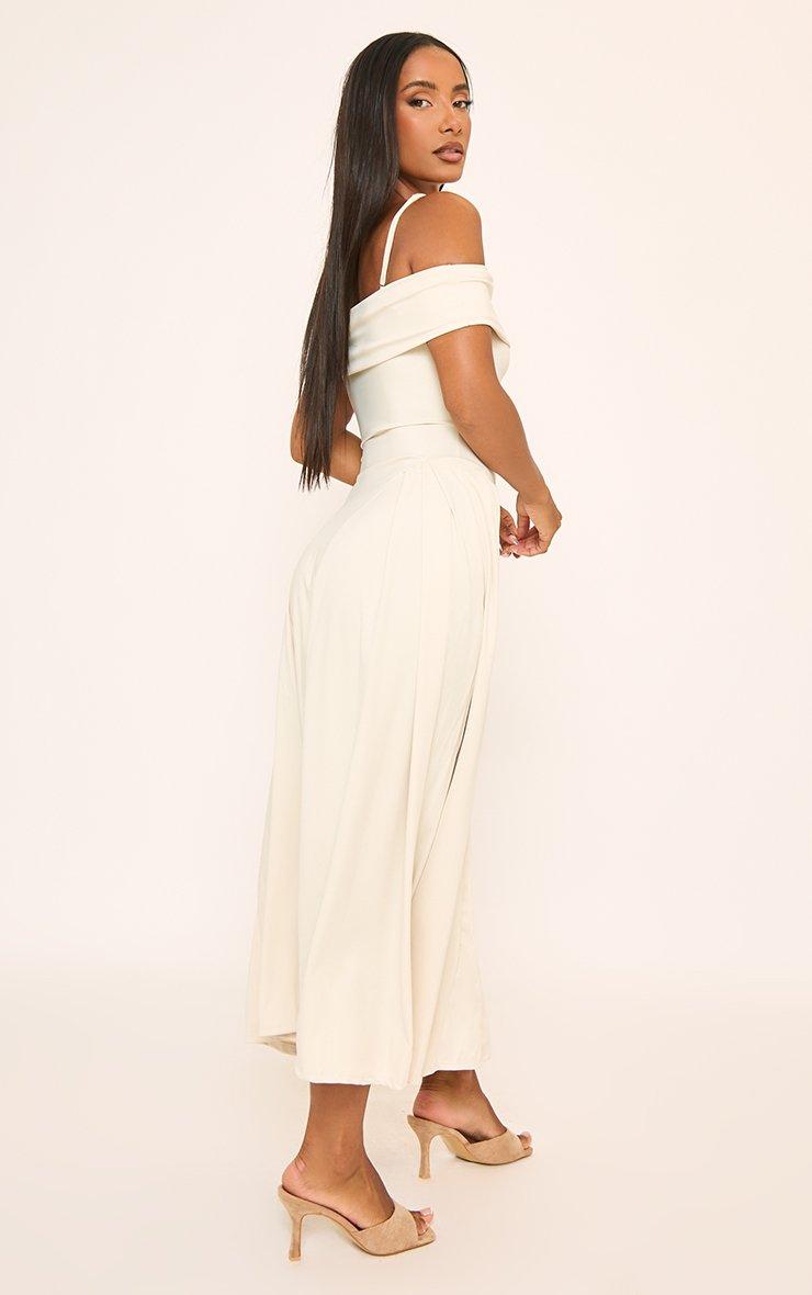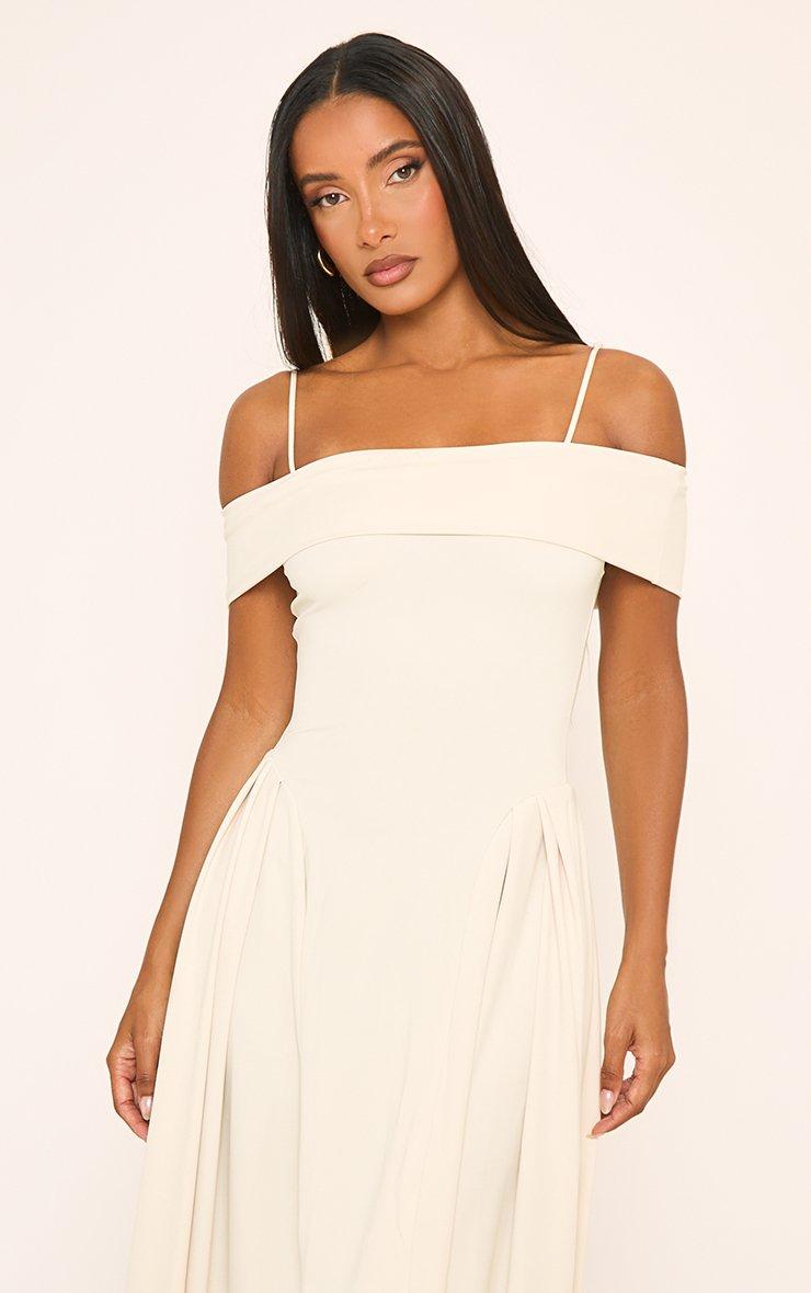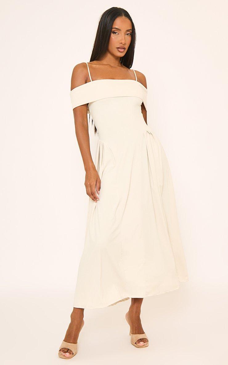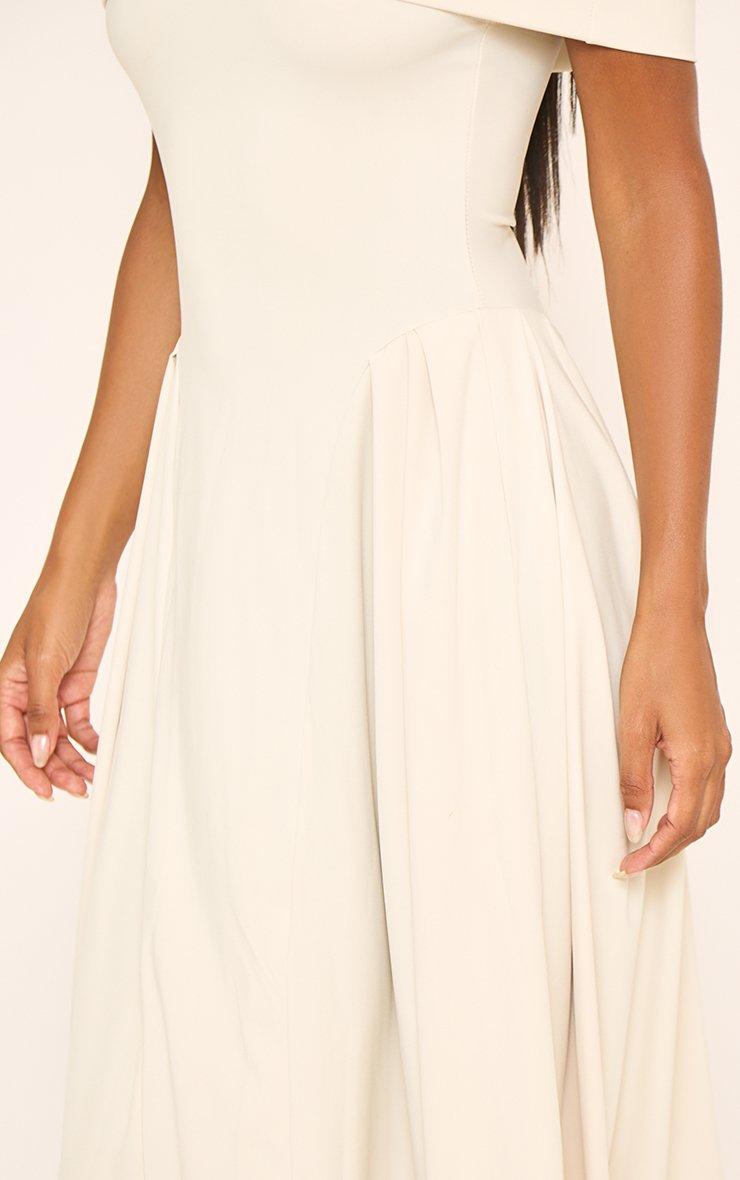 Elegant with a modern twist, doll. Featuring a cream material with a Bardot neckline and a dropped waist detail, this midi dress is effortlessly chic and perfect for any sophisticated moment.