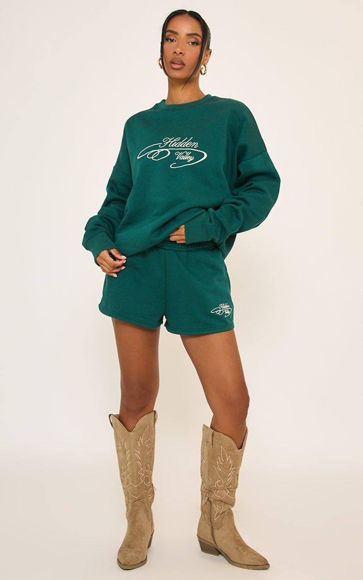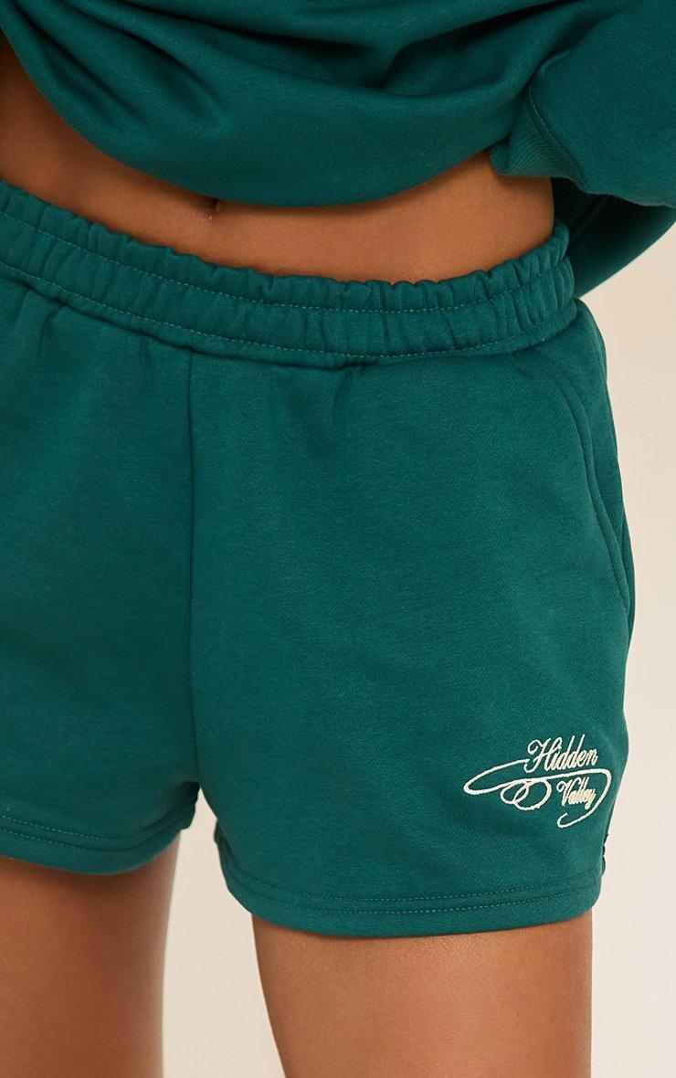 Stay chill with attitude, doll! These green high-waist sweat shorts with embroidered "Hidden Valley" graphic are giving you the perfect mix of comfort and bold style—ideal for a laid-back, eye-catching look.