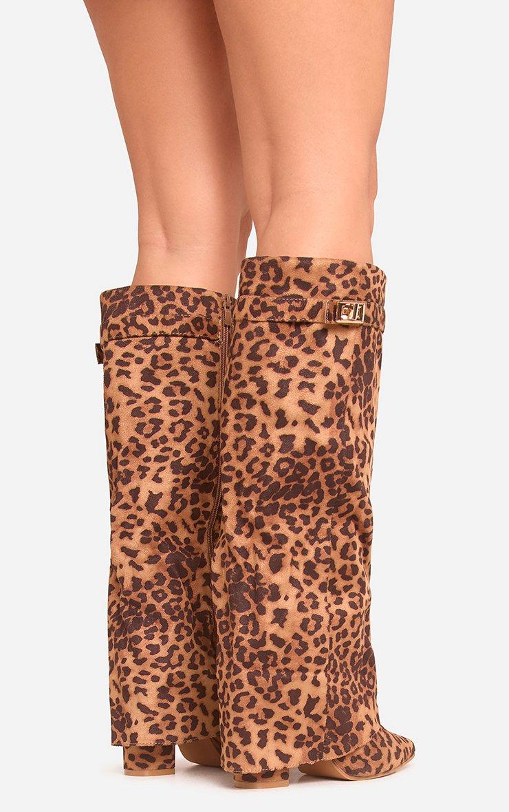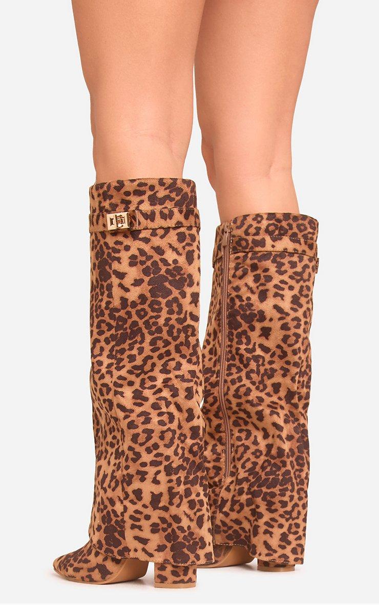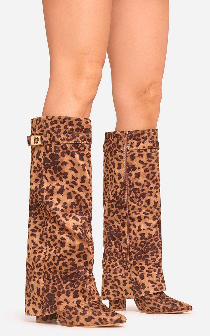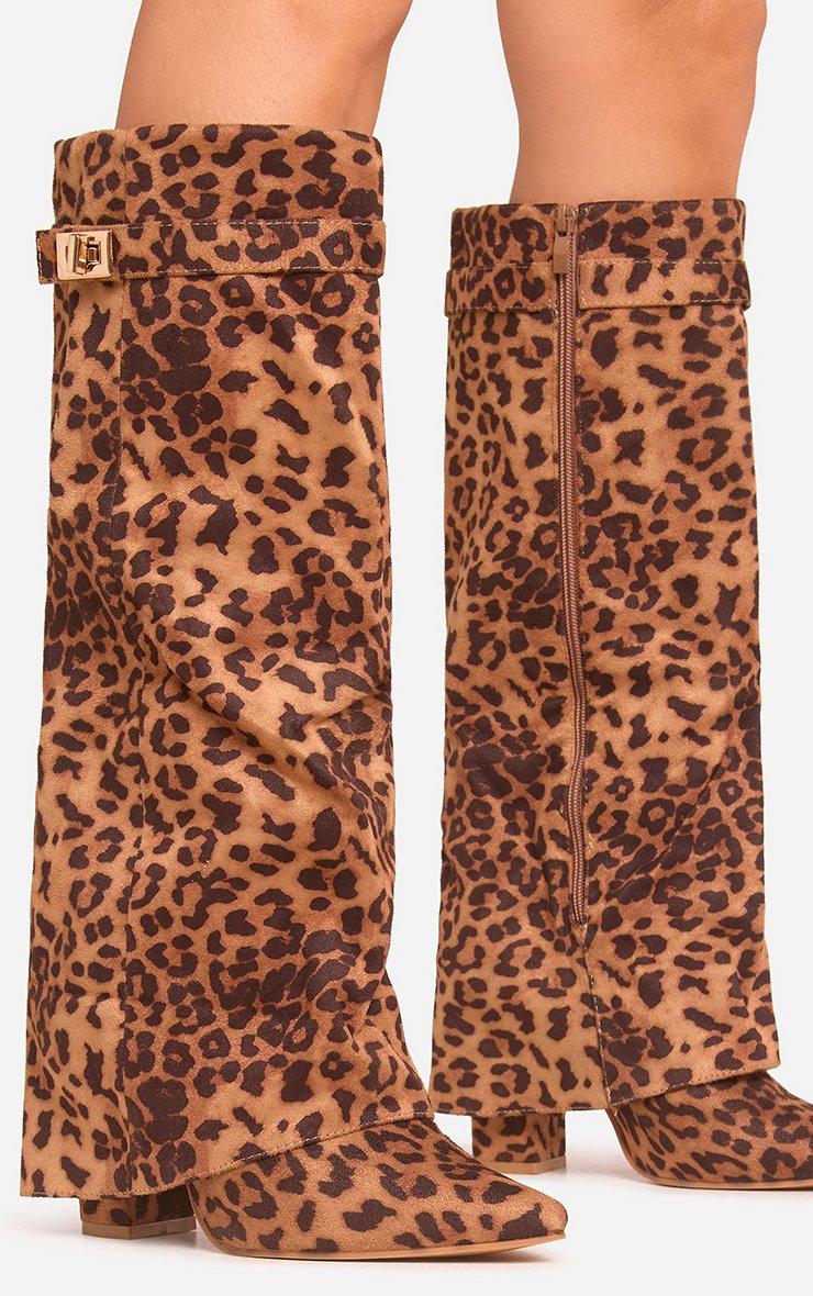 Strut your stuff in these Ava Lock Detail Pointed Toe Knee High Block Heel Boot In Leopard Print Faux Suede. These leopard print boots are about to be your new obsession with their sleek pointed toe, comfy block heels and edgy lock detail. The leopard print faux suede is totally trending right now, so what are you waiting for? Snatch up these fierce knee-high boots!