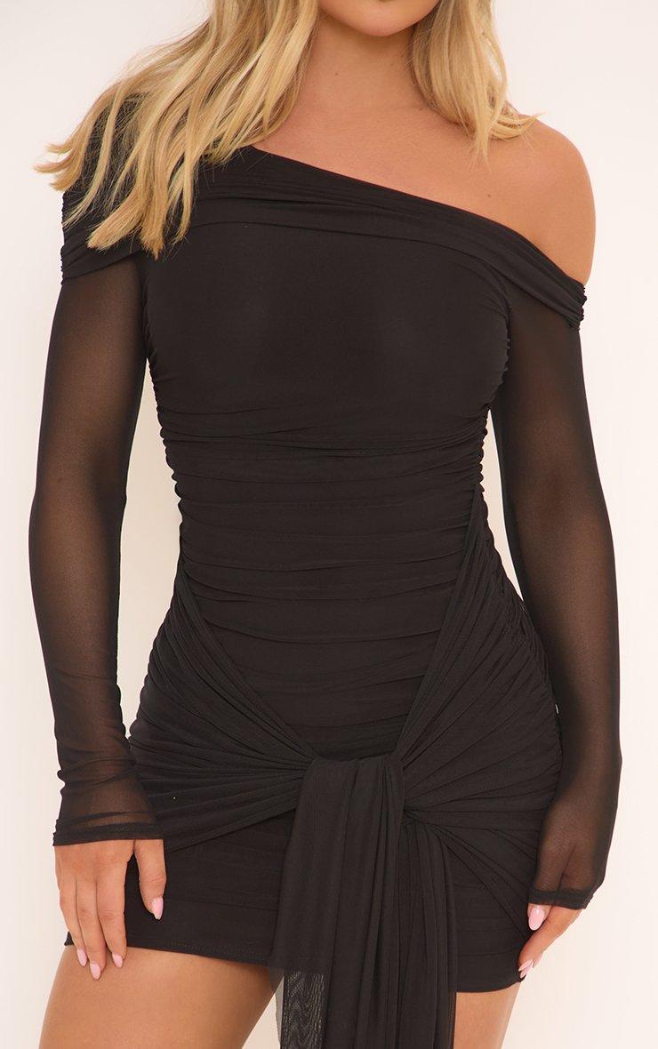 Serving pure elegance with an edge, doll. Featuring a black material with an off-the-shoulder design, long sleeves, a drape front, and contrast detailing, this mini dress is the perfect mix of chic and statement-making.