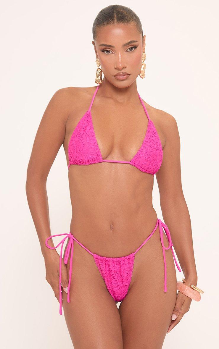 Triangle Tie Side Thong Bikini Set In Pink Lace