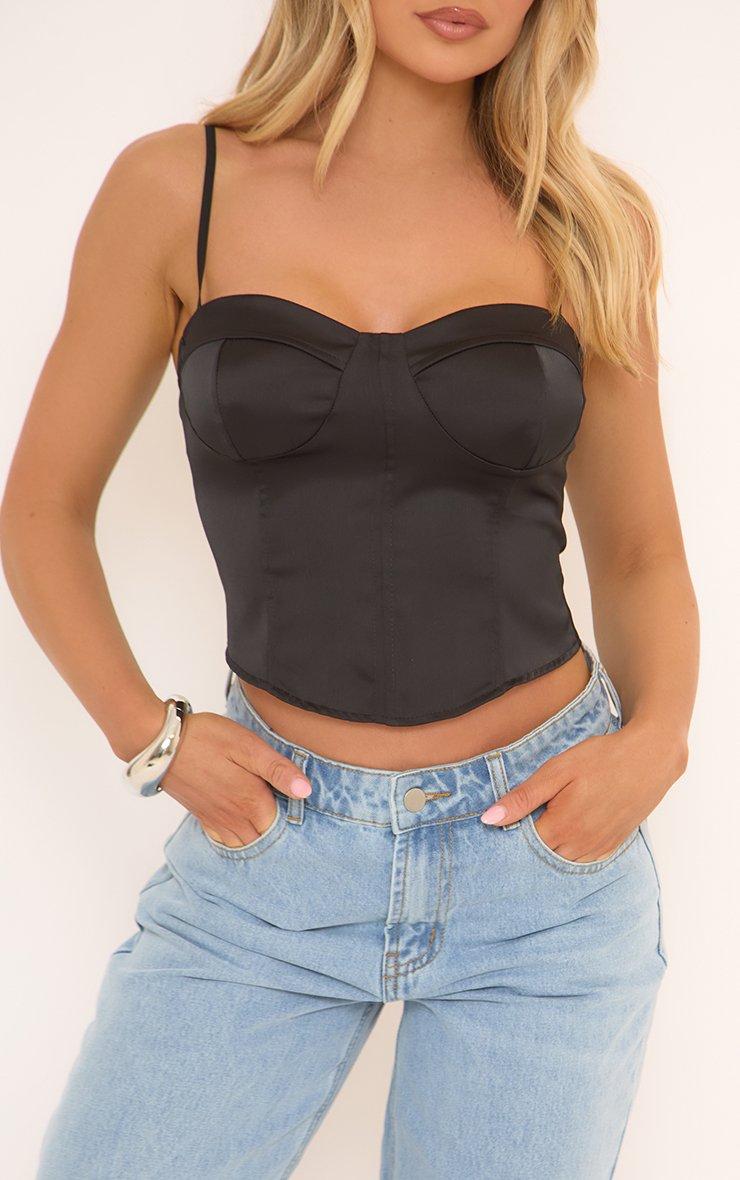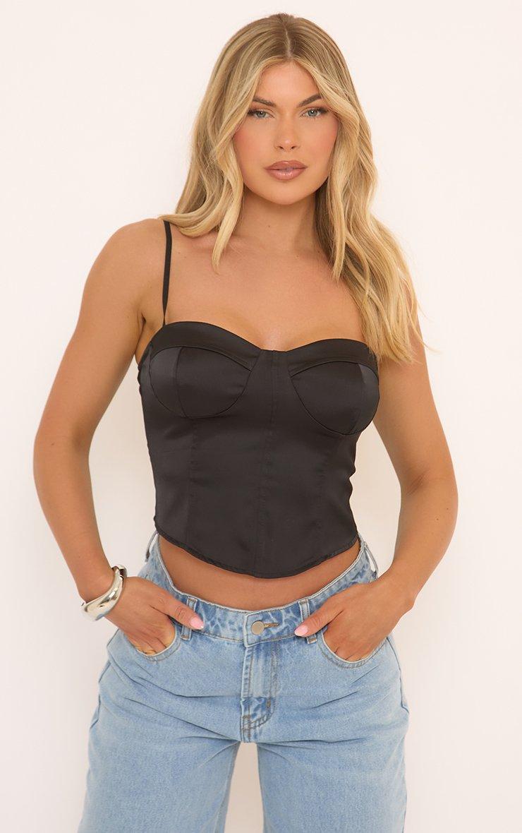 Ready to turn heads, doll? Featuring a black satin material with a sweetheart neckline and corset-style panelling, this top is the definition of chic. A sleek, structured fit for that effortlessly luxe vibe.