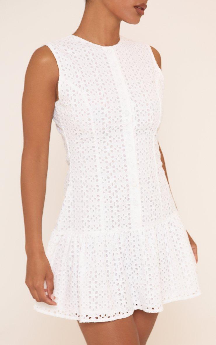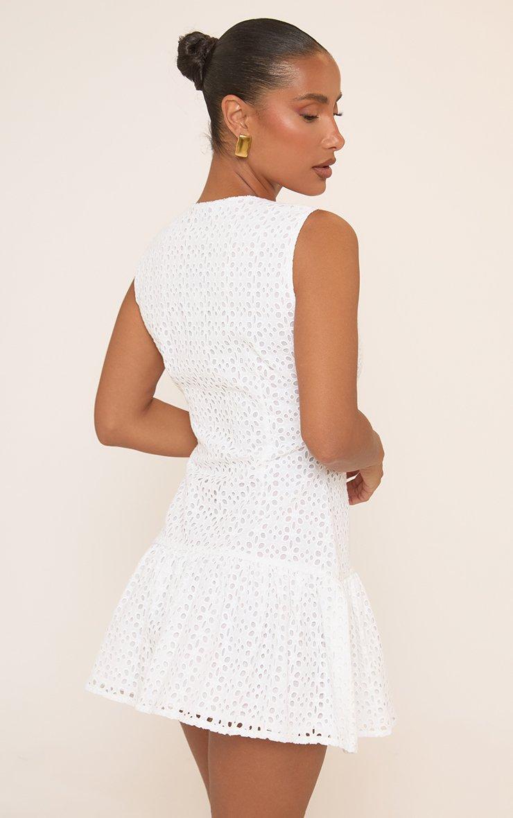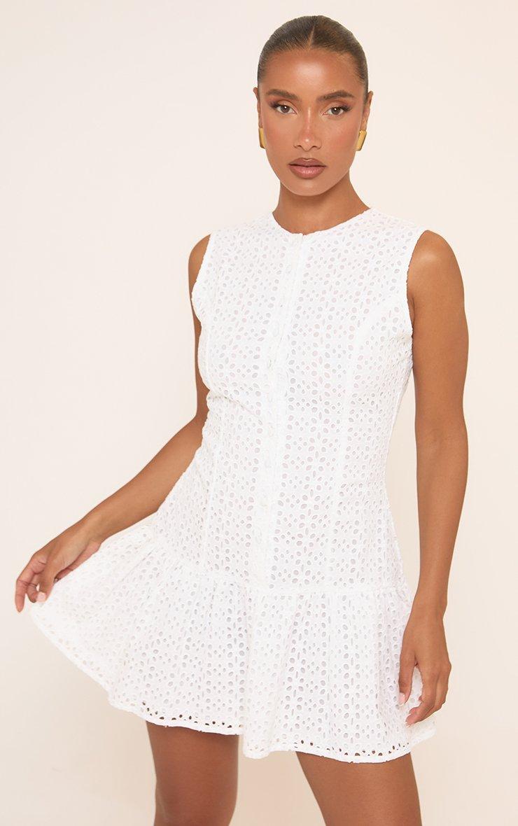 Sleeveless Button Front Pleated Mini Dress In White Broderie