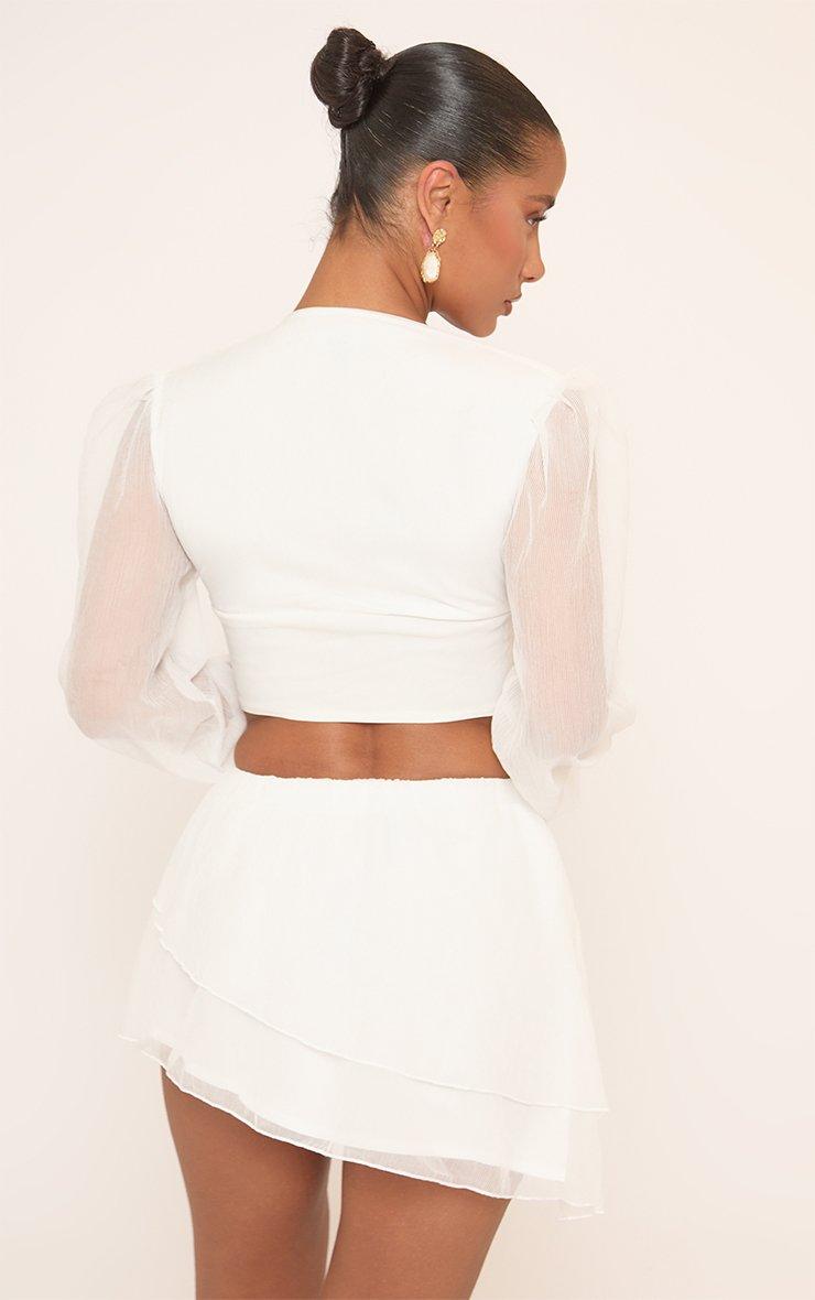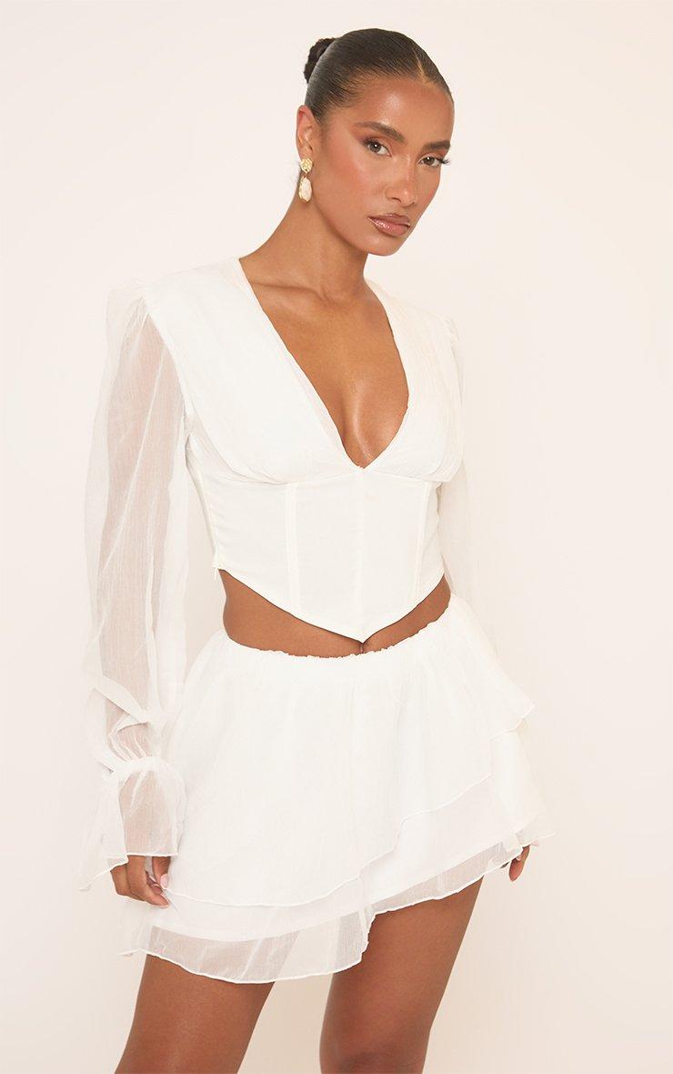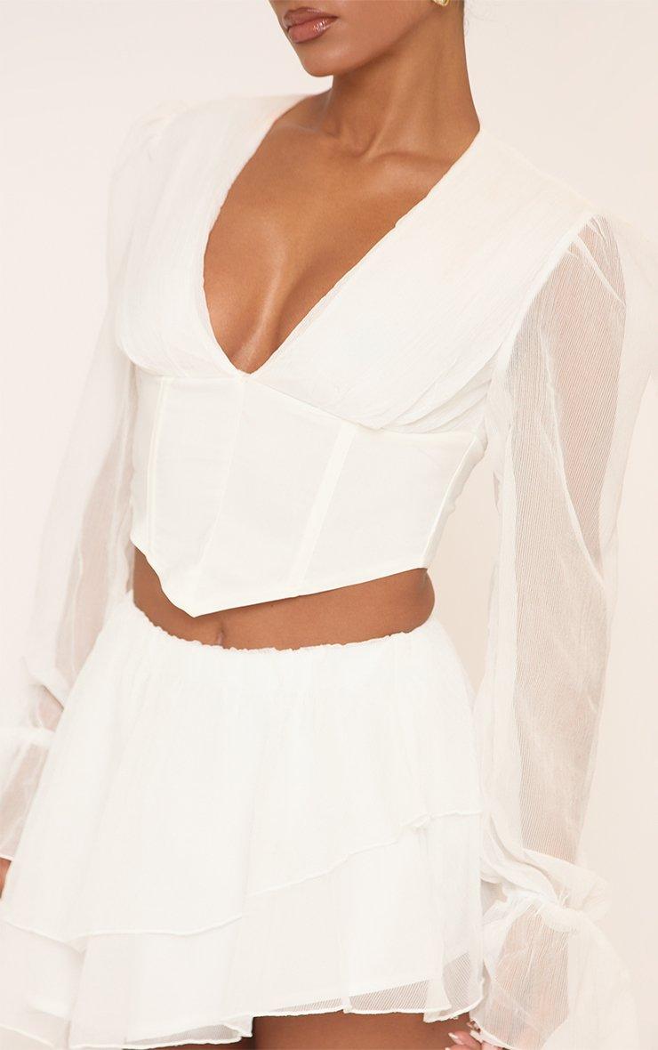 Long Puff Sleeve V Neck Corset Top In Cream Woven