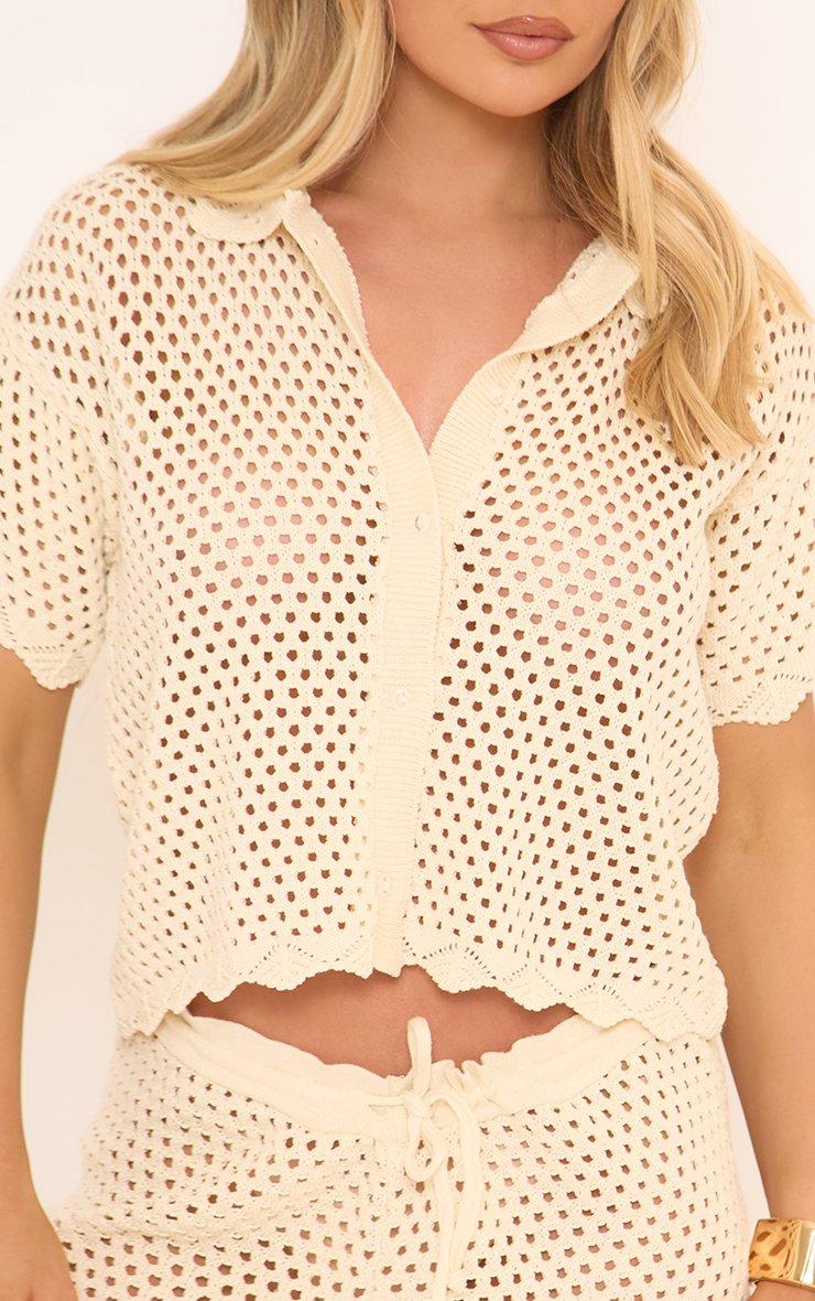 Short Sleeve Scallop Hem Detail Shirt In Cream Crochet Knit