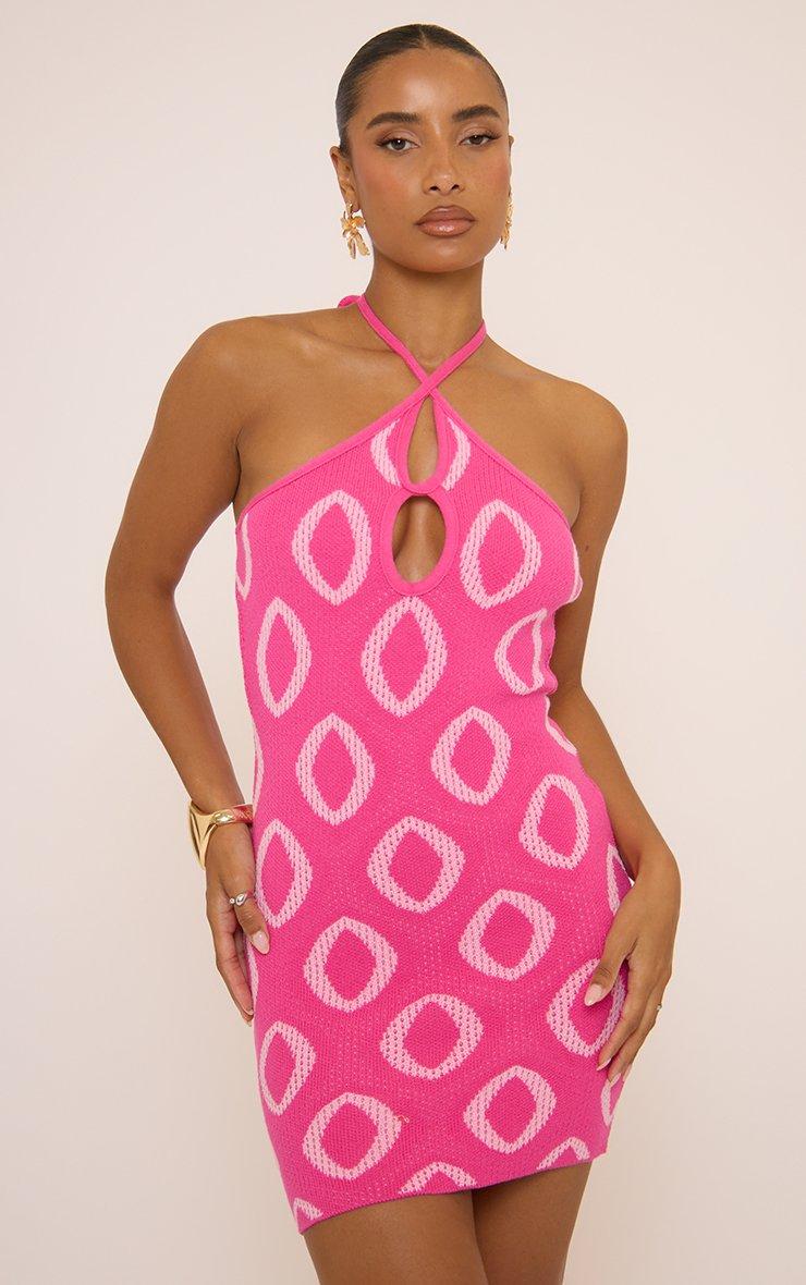 For fun nights out or weekend vibes, doll. Featuring pink patterned knit fabric with a halterneck and keyhole detailing, this mini dress brings playful charm with a bold, stylish edge.