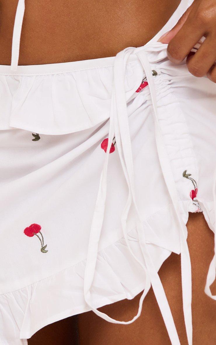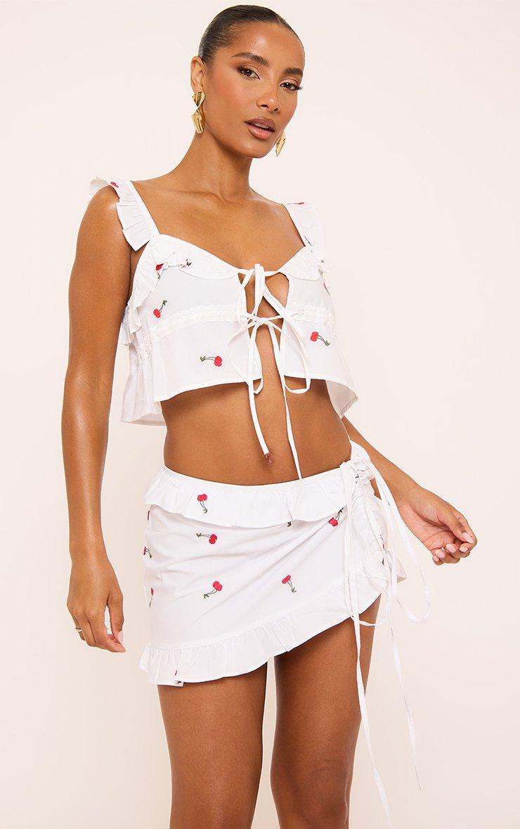 Perfect for weekend vibes, featuring white material with ruched side, embroidered cherry and ruffle detailing—this mini skirt brings playful charm and major sass, doll. Cherry on top, always.