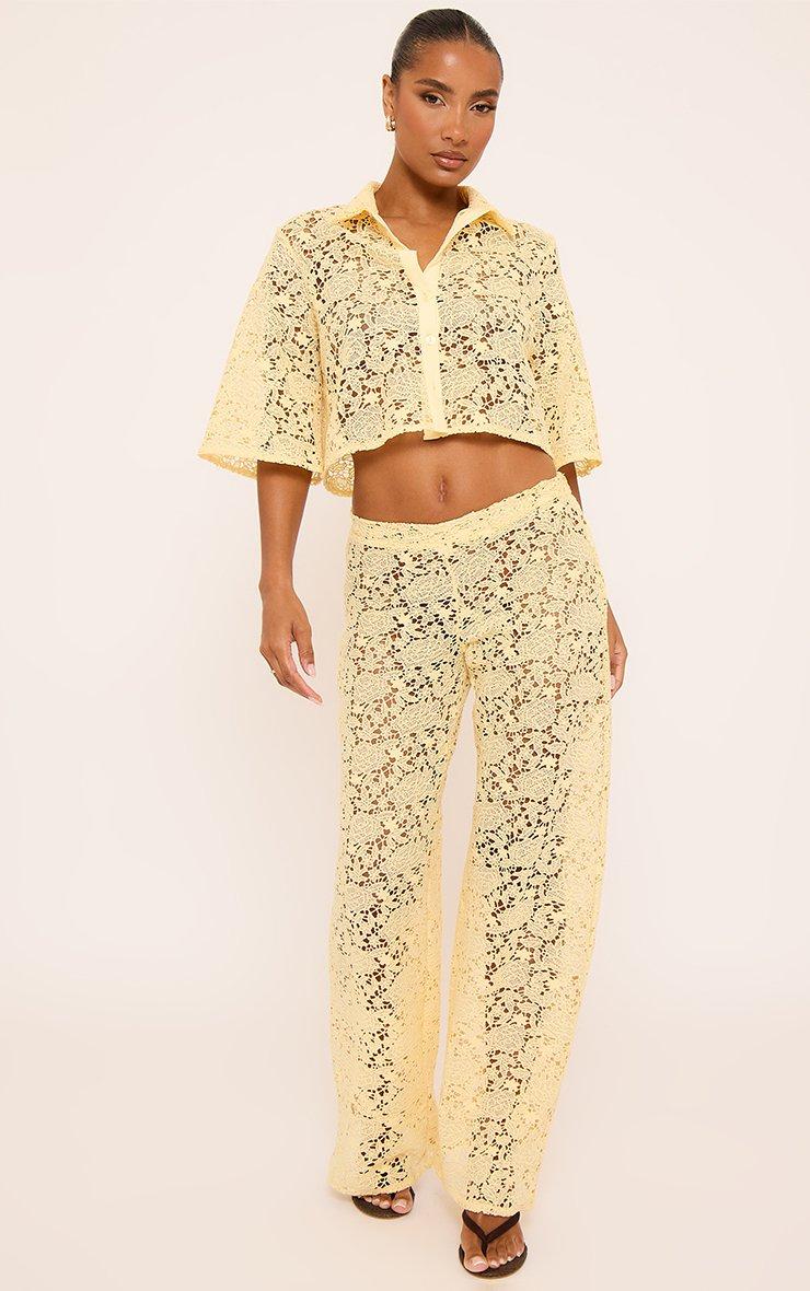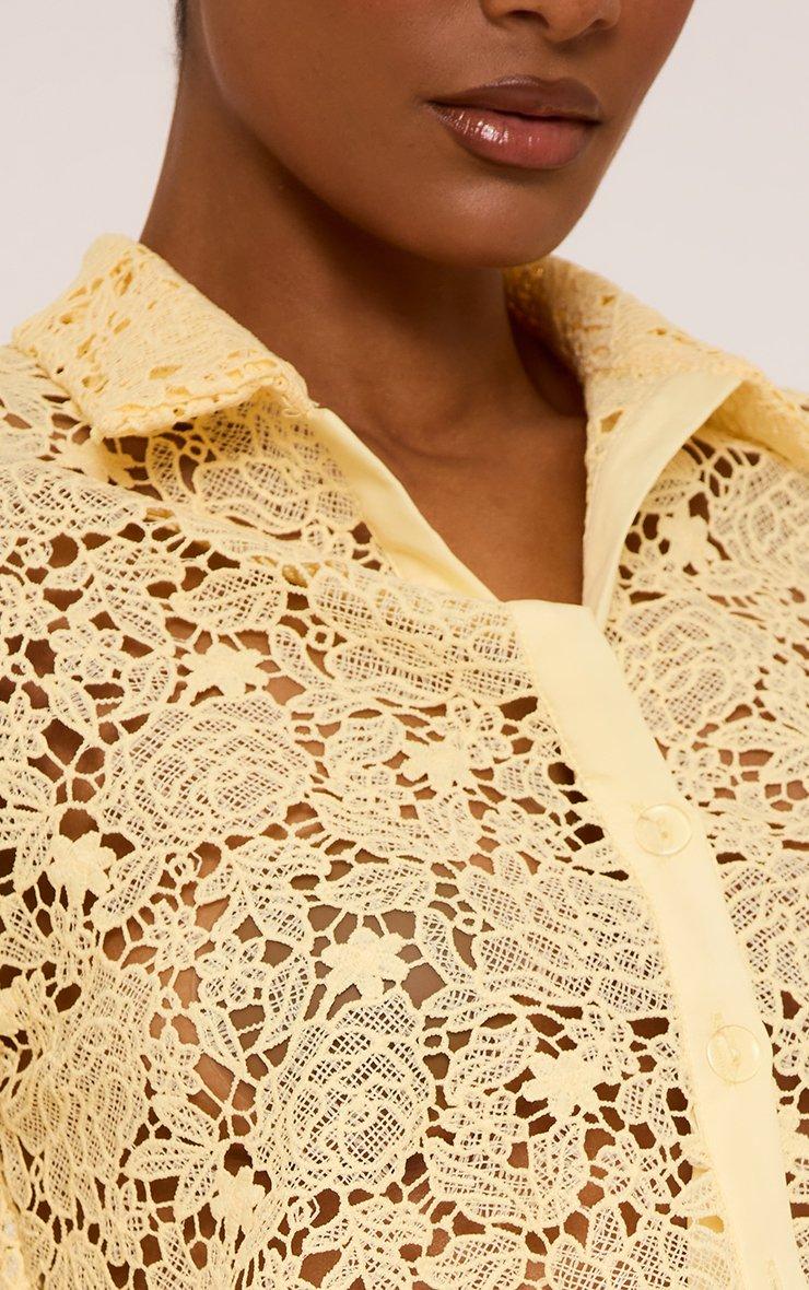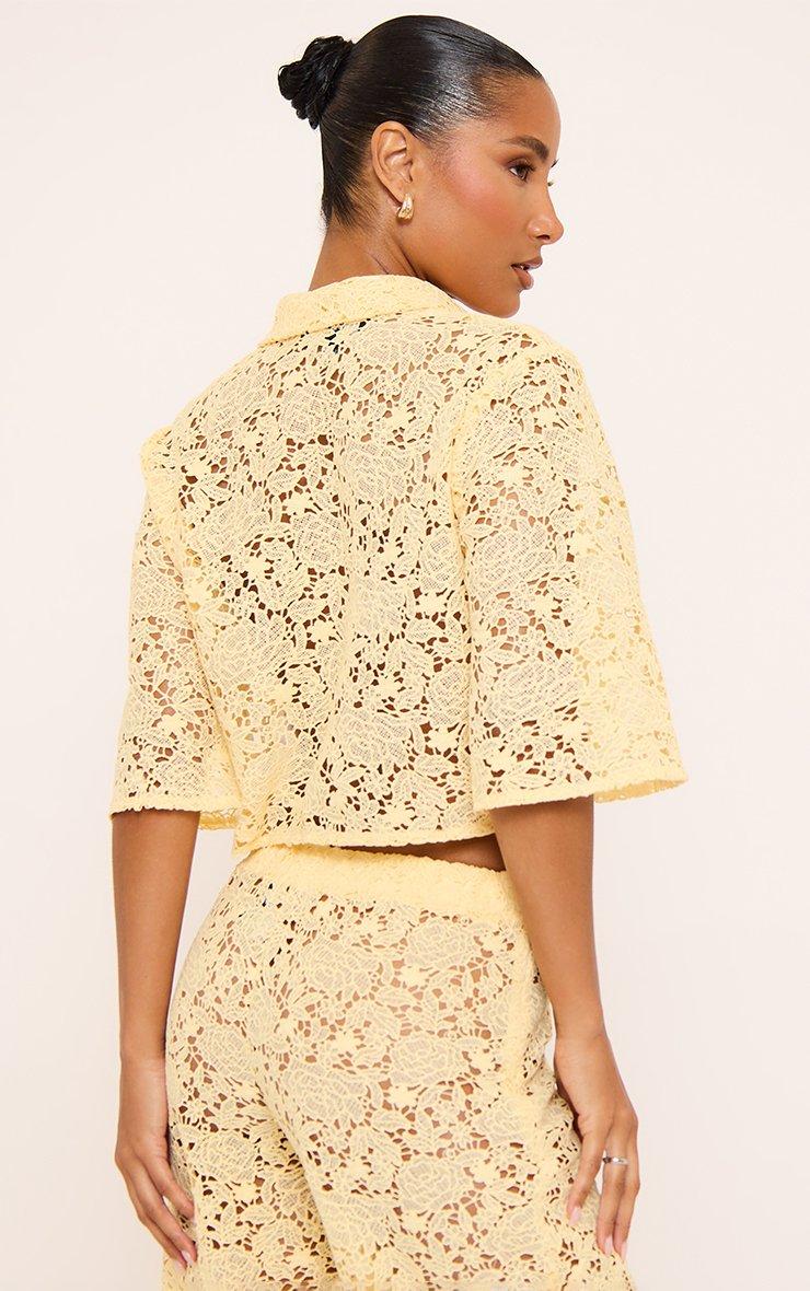 Short Sleeve Button Front Boxy Cropped Shirt In Lemon Crochet Lace
