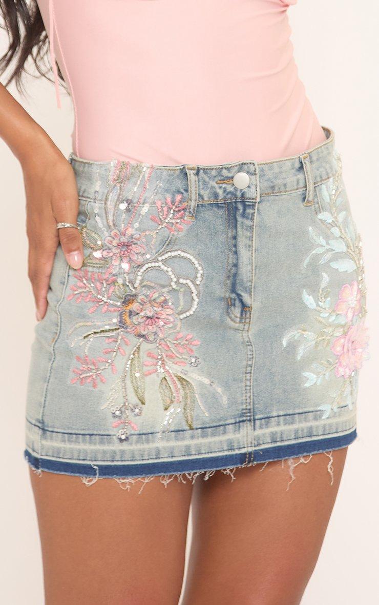 Low Rise Multi Floral Sequin Detail Mini Skirt In Blue Denim