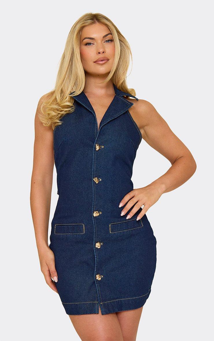 Sleeveless Collared Button Detail Fitted Mini Dress In Mid Blue Denim