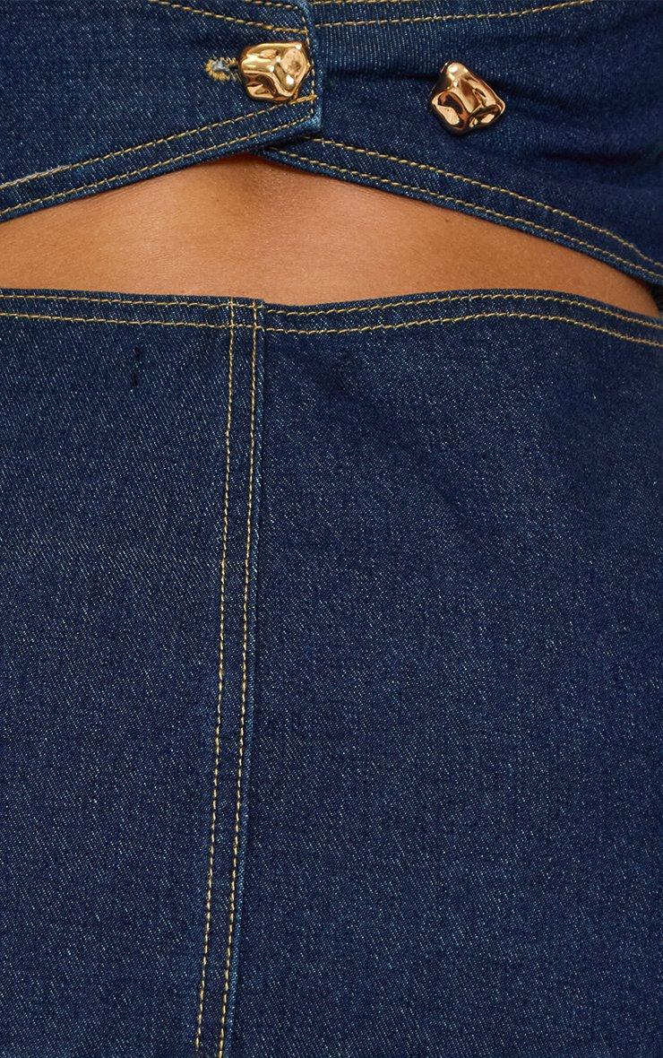 Perfect for daytime vibes or brunch dates, featuring mid blue denim material with collared and button detailing and sleeveless fit for a chic, it-girl finish.