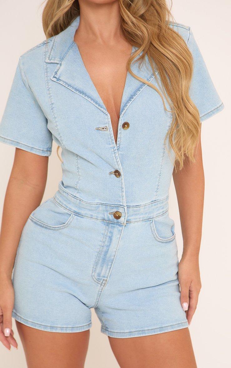 Short Sleeve Plunge Front Collared Playsuit In Light Blue Denim