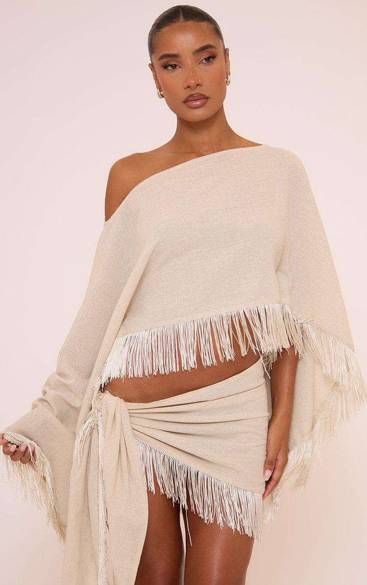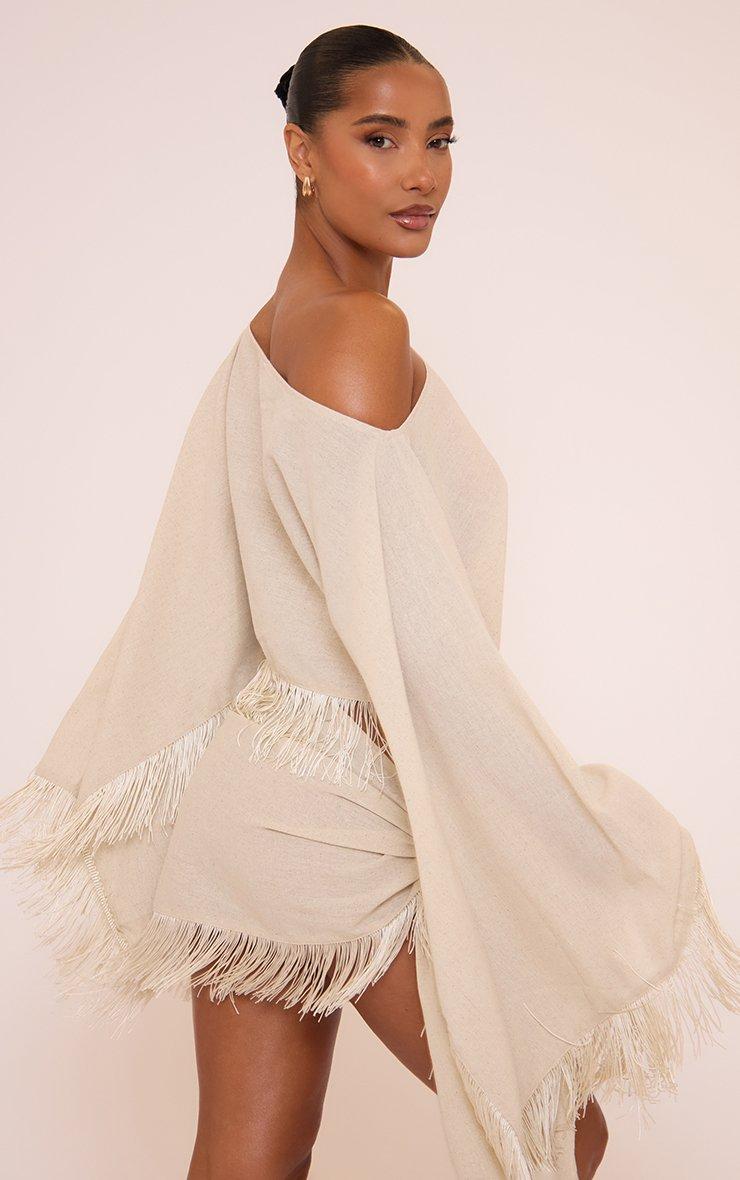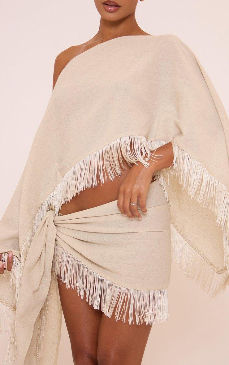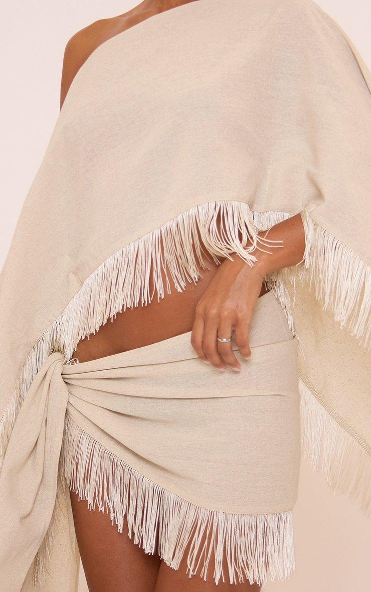 Off The Shoulder Fringe Detail Cape Top And Tie Side Mini Skirt Co-Ord Set In Stone Linen