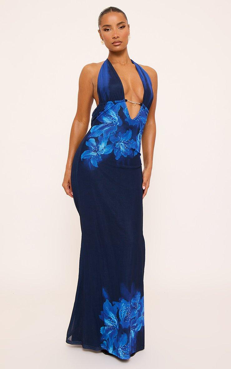 Plunge Halterneck Trim Detail Maxi Dress In Blue Floral Print