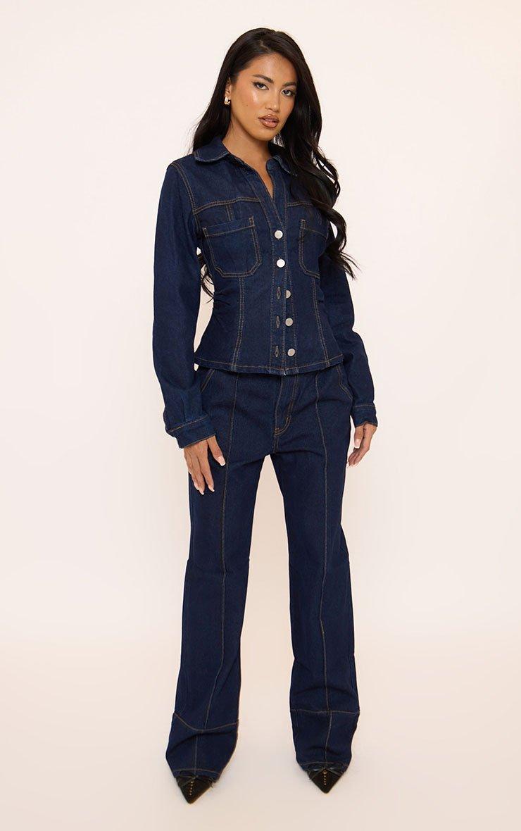 Long Sleeve Gold Button Down Seam Detail Cinched Waist Jacket In Indigo Blue Denim