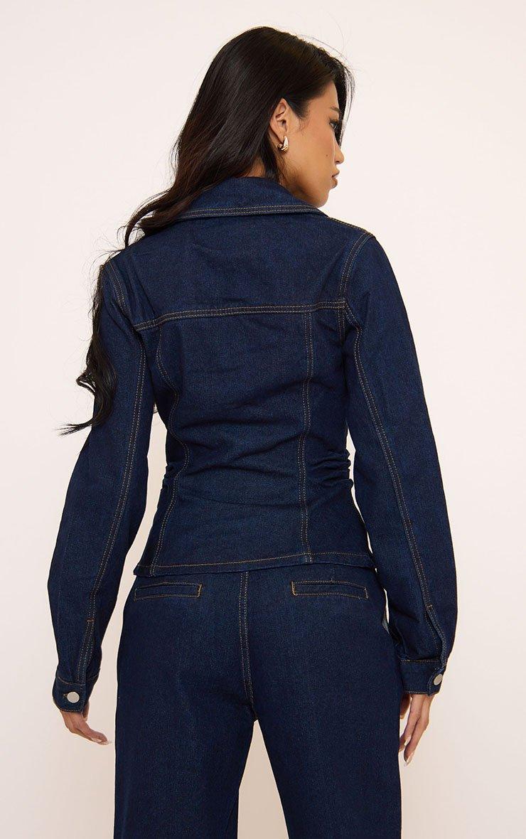 Set trends in our Long Sleeve Gold Button Down Seam Detail Cinched Waist Jacket In Indigo Blue Denim. This dark denim cinched jacket features luxe gold buttons and chic seam details. Style this denim jacket with the matching jeans for a dressy denim moment. Ensure to wash following the care instructions on the label before wearing.