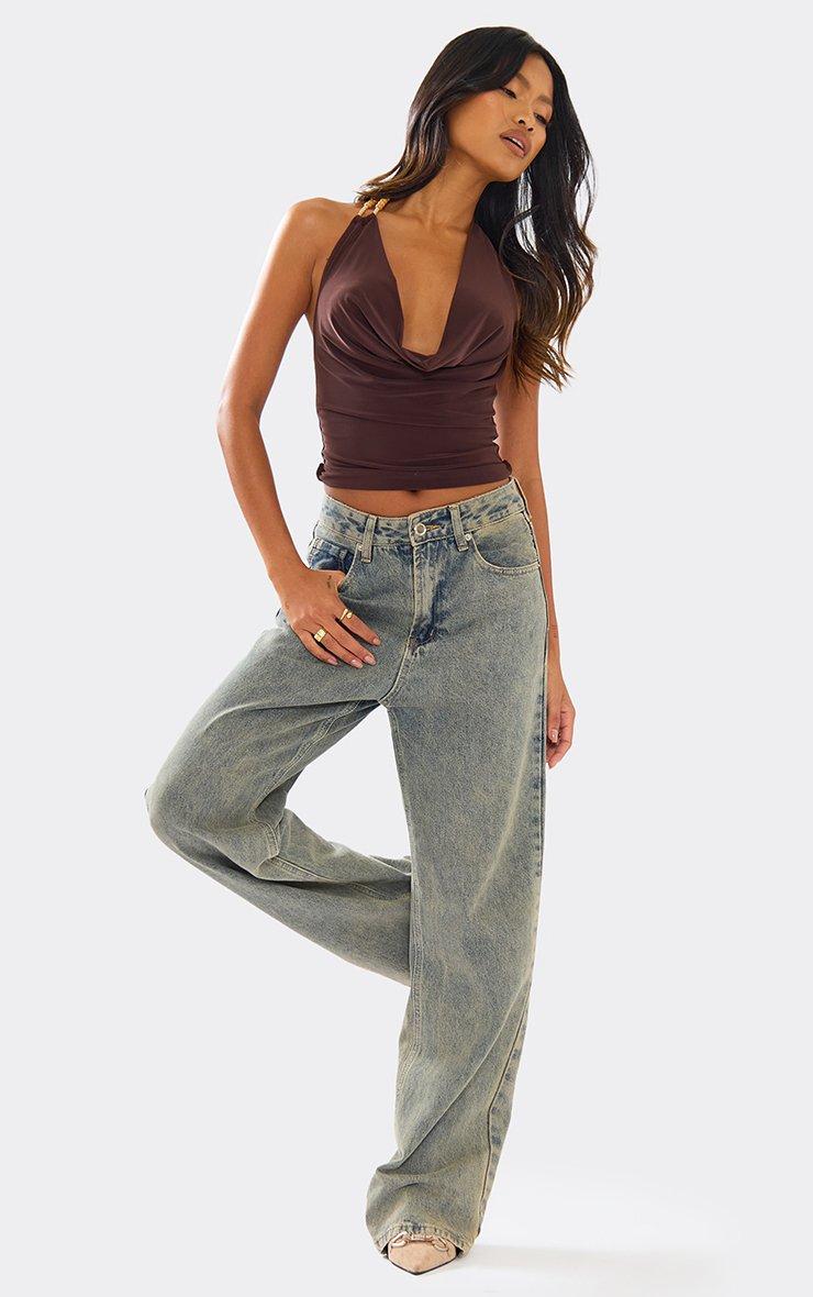 Sleeveless Cowl Neck Bead Trim Detail Top In Brown