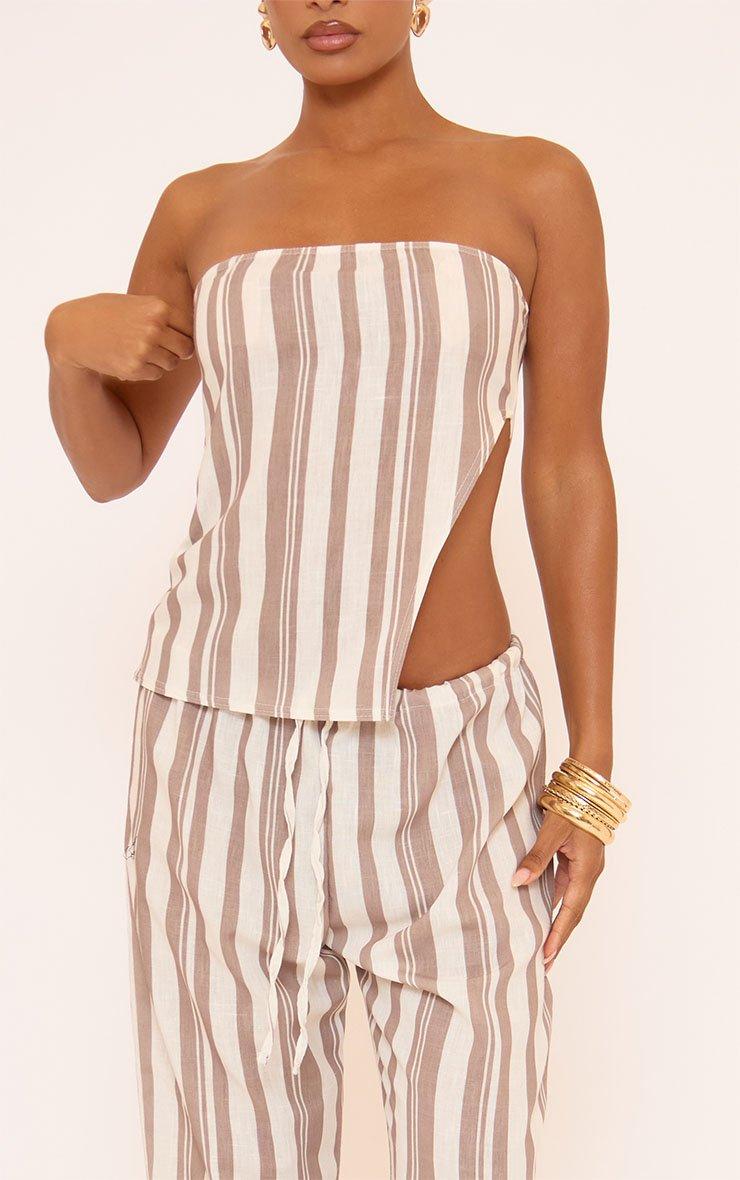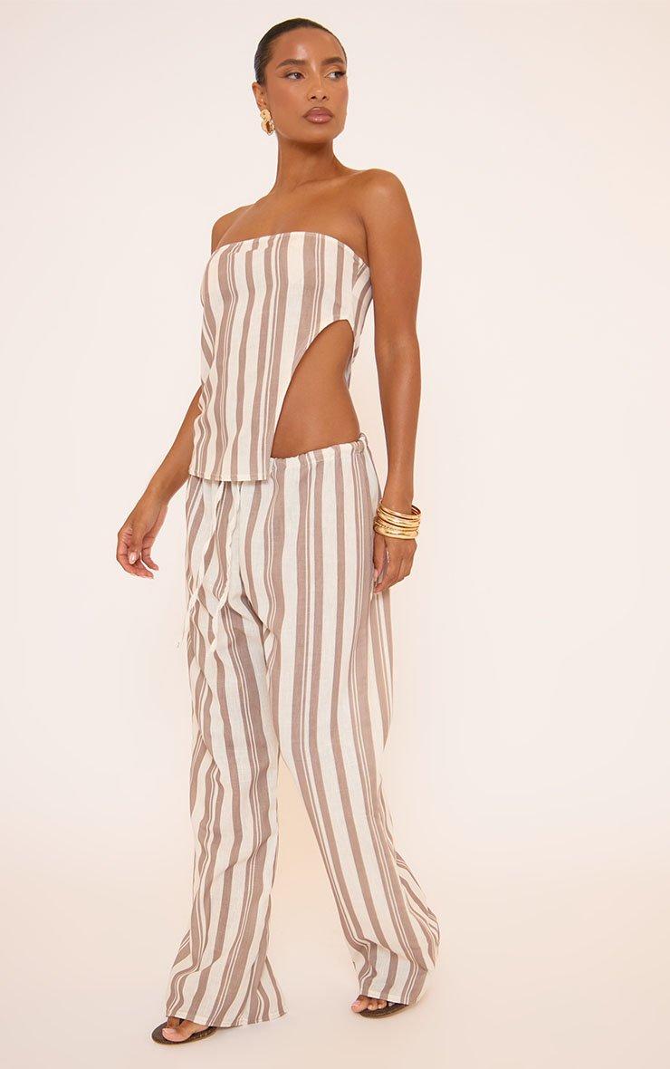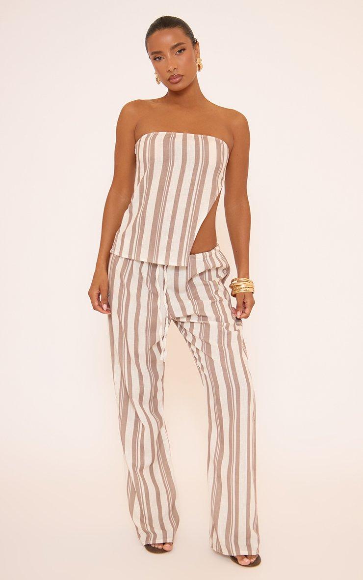 Step out fresh, doll! Featuring brown stripe linen fabric with mid rise and wide leg detailing, these trousers bring bold, chic vibes with laid-back sophistication.