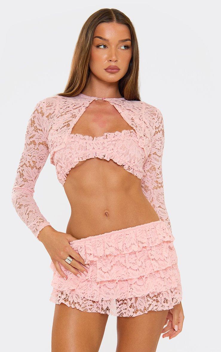 Serve delicate edge, doll! Featuring soft pink lace with button neck, long sleeves, and split front detailing, this top brings fresh, chic vibes perfect for standout days with playful flair.
