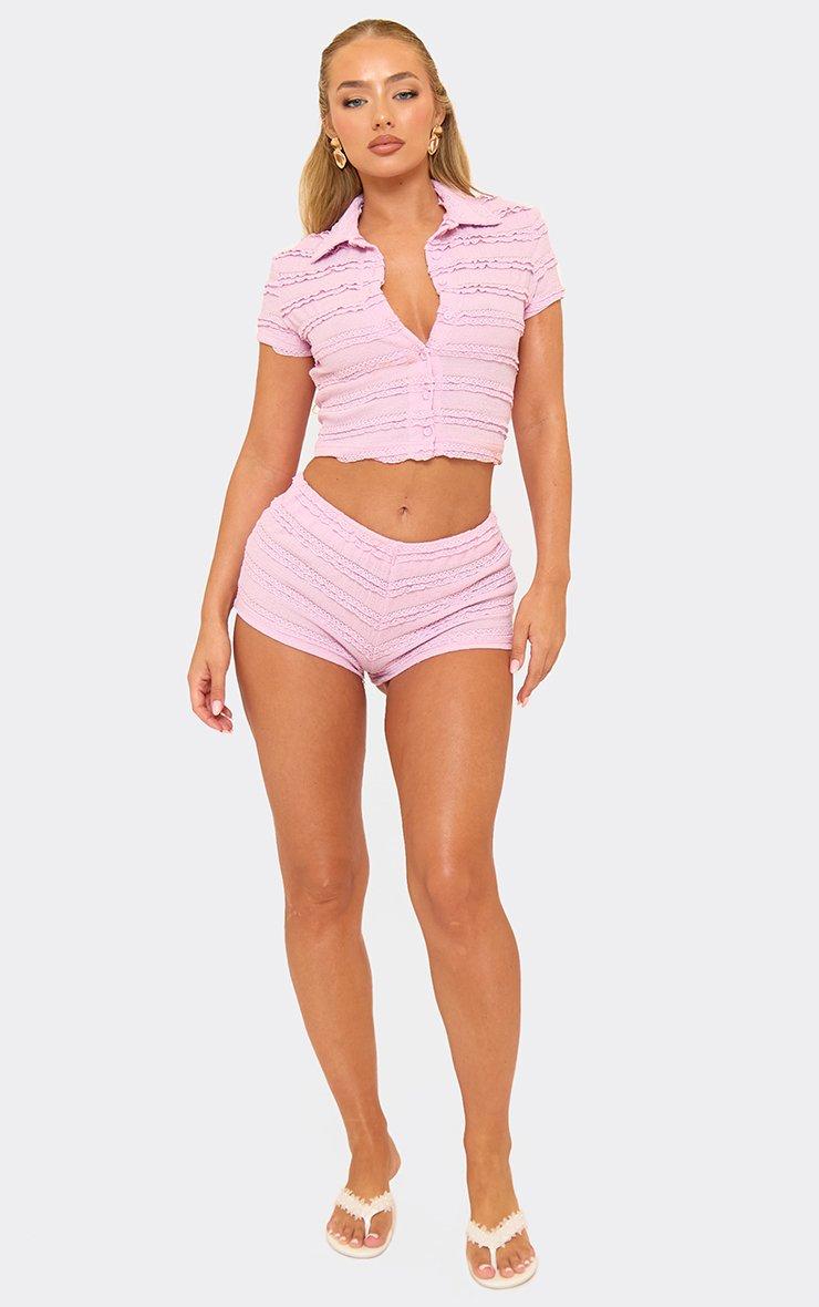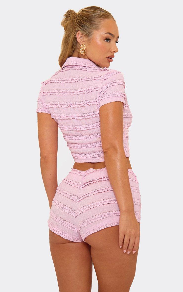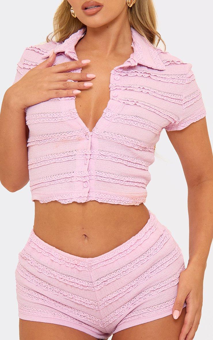 Short Sleeved Button Front Collar Detail Crop Top In Pink Textured