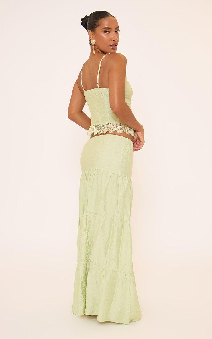 Strappy Lace Trim Tie Front Top And Tiered Maxi Skirt Co-Ord Set In Green