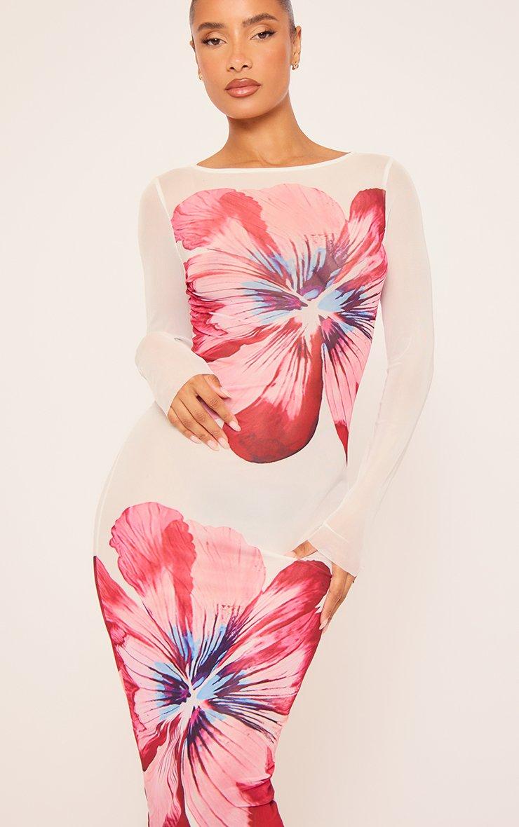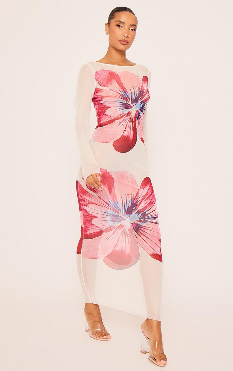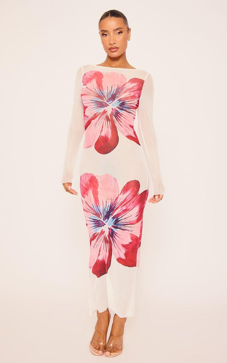 Long Sleeve Maxi Dress In White Large Floral Printed Mesh