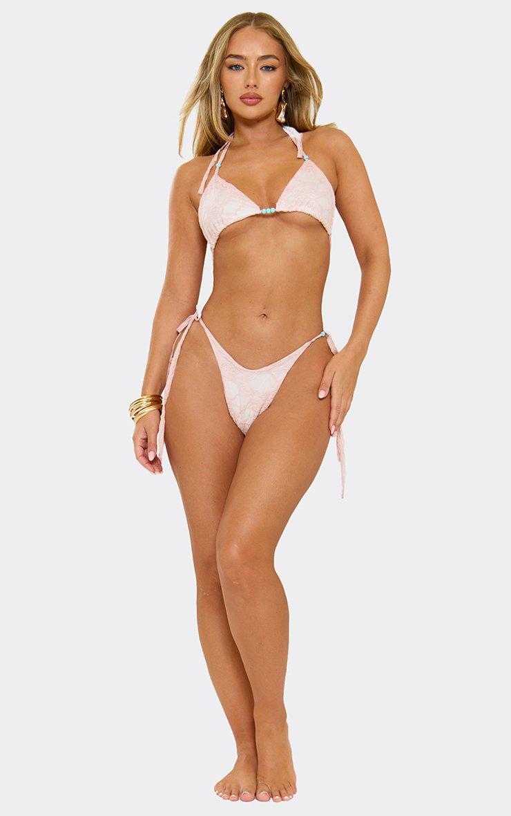 Triangle Bead Trim Thong Bikini Set In Pink Lace