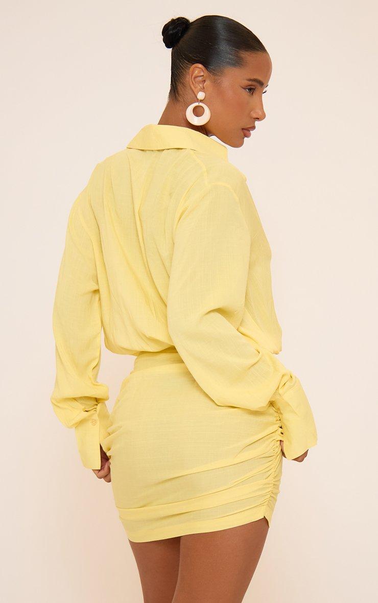 Long Sleeve Ruched Skirt Detail Mini Dress In Yellow Linen