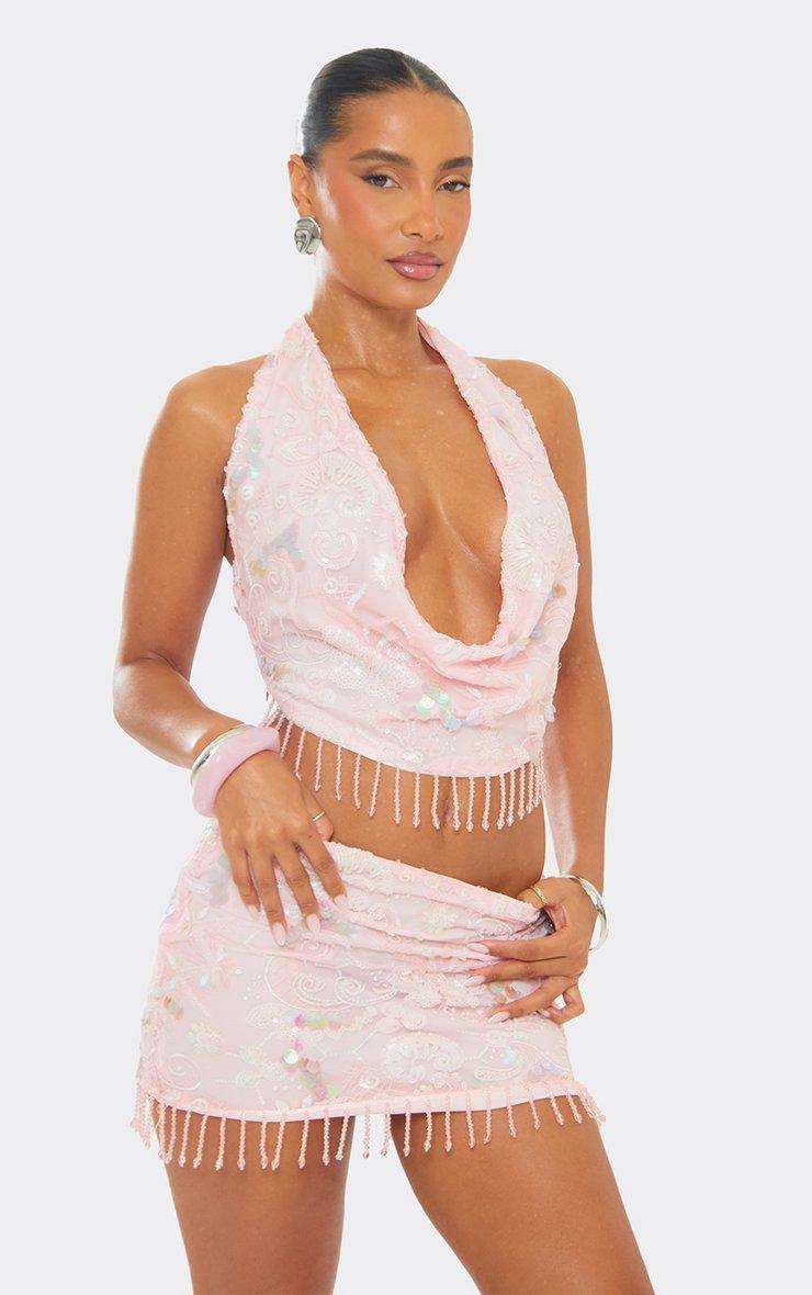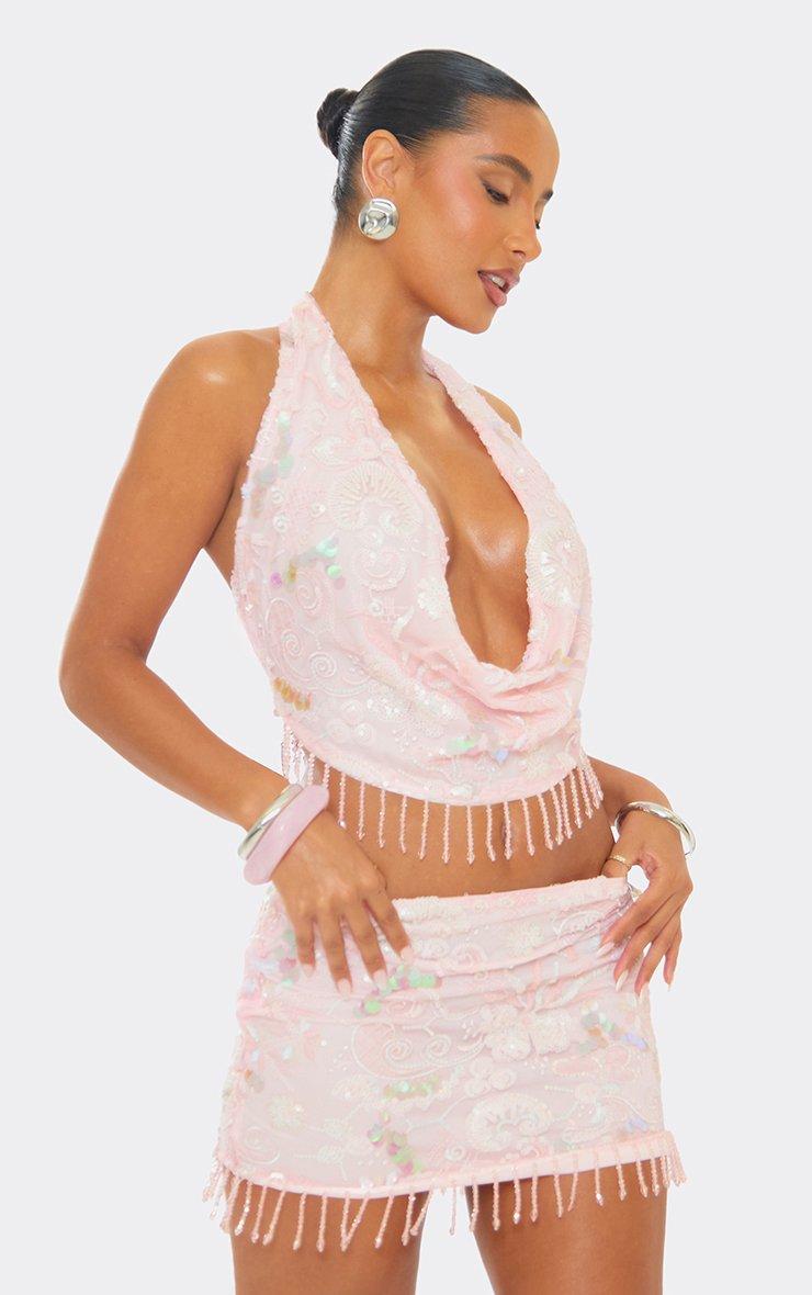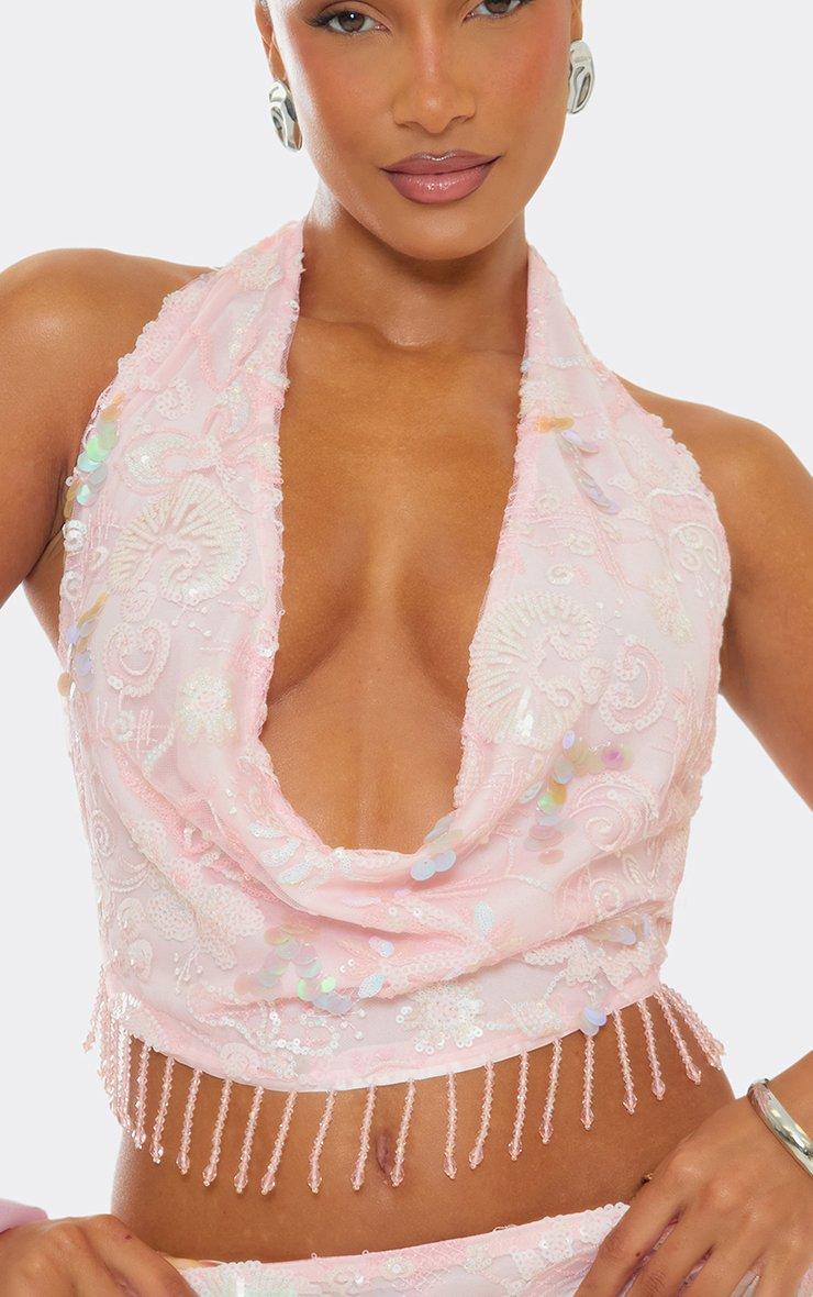 Perfect for turning heads on your next night out, doll. Featuring a pink sequin material with bead tassel detailing, this cowl neck top brings all the glam vibes for your weekend plans.