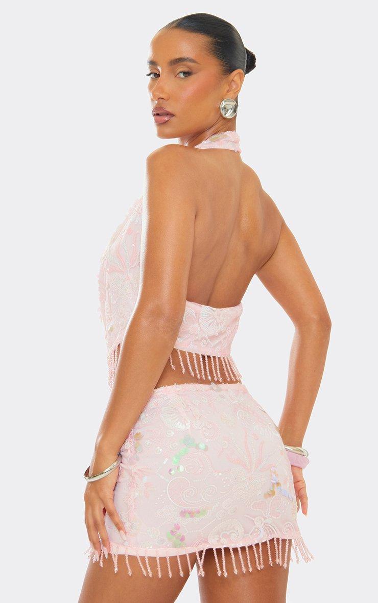 Cowl Neck Bead Tassel Trim Detail Top In Pink Sequin