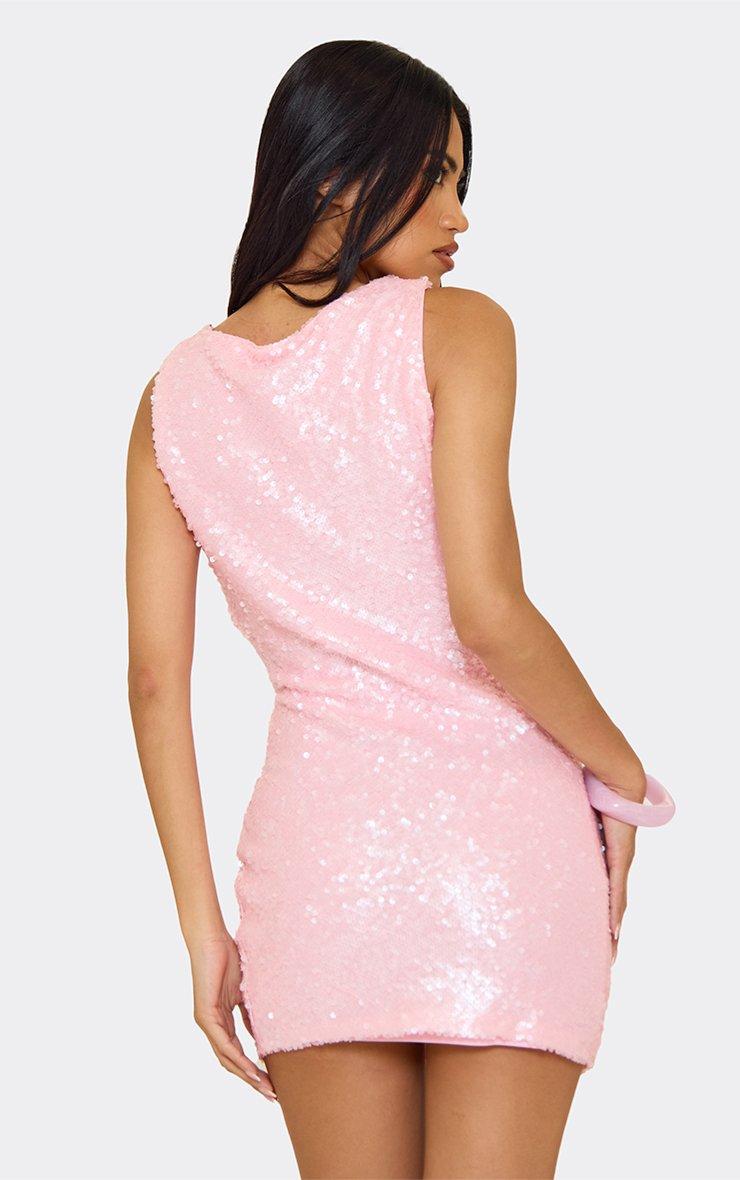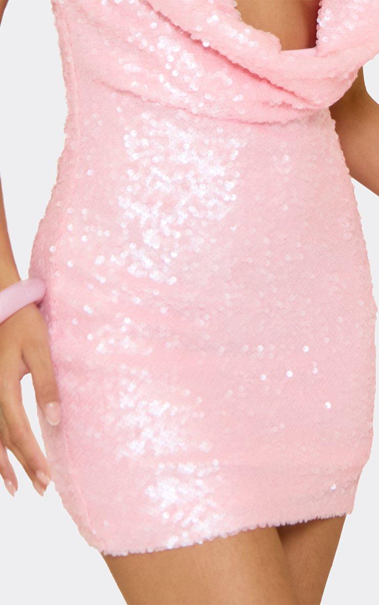 Cowl Neck Mini Dress In Baby Pink Sequin